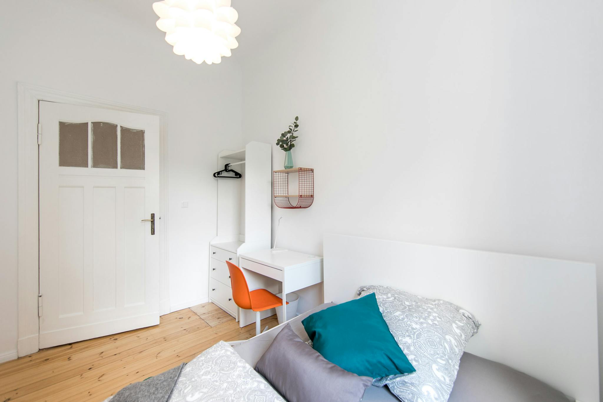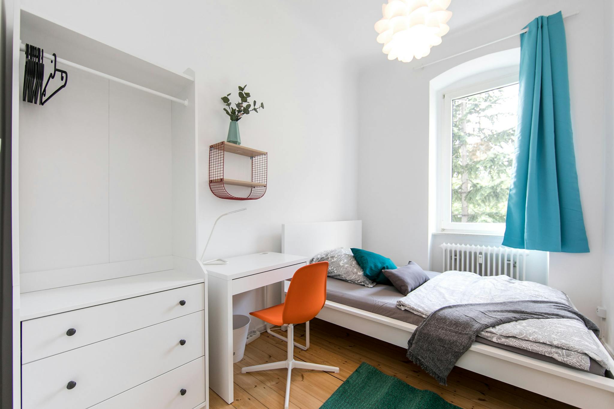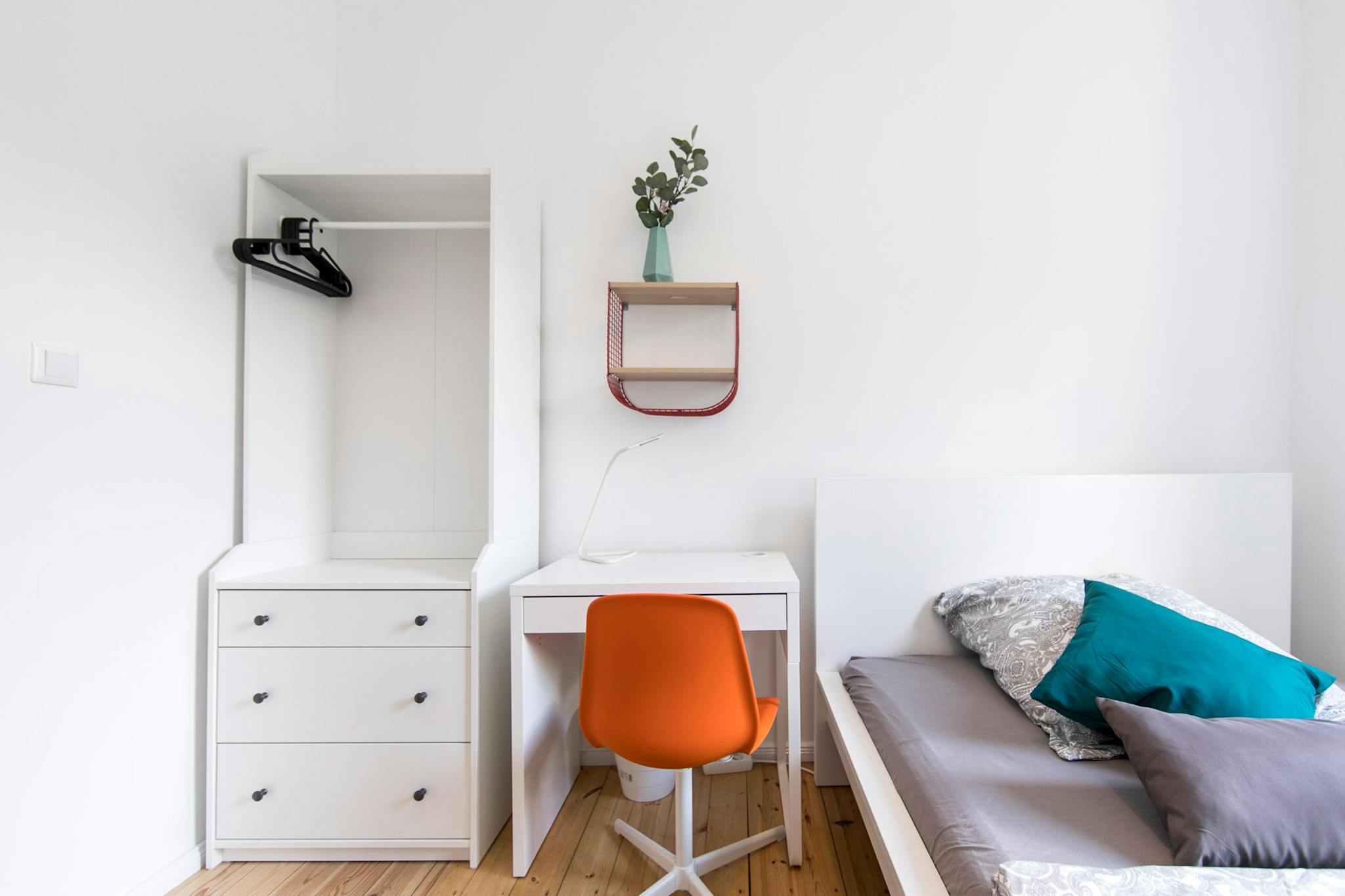 Fully furnished with a comfy bed, desk, chair, and wardrobe.