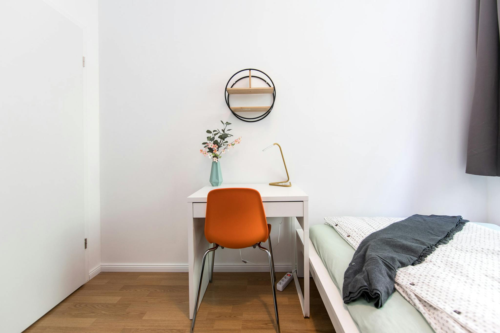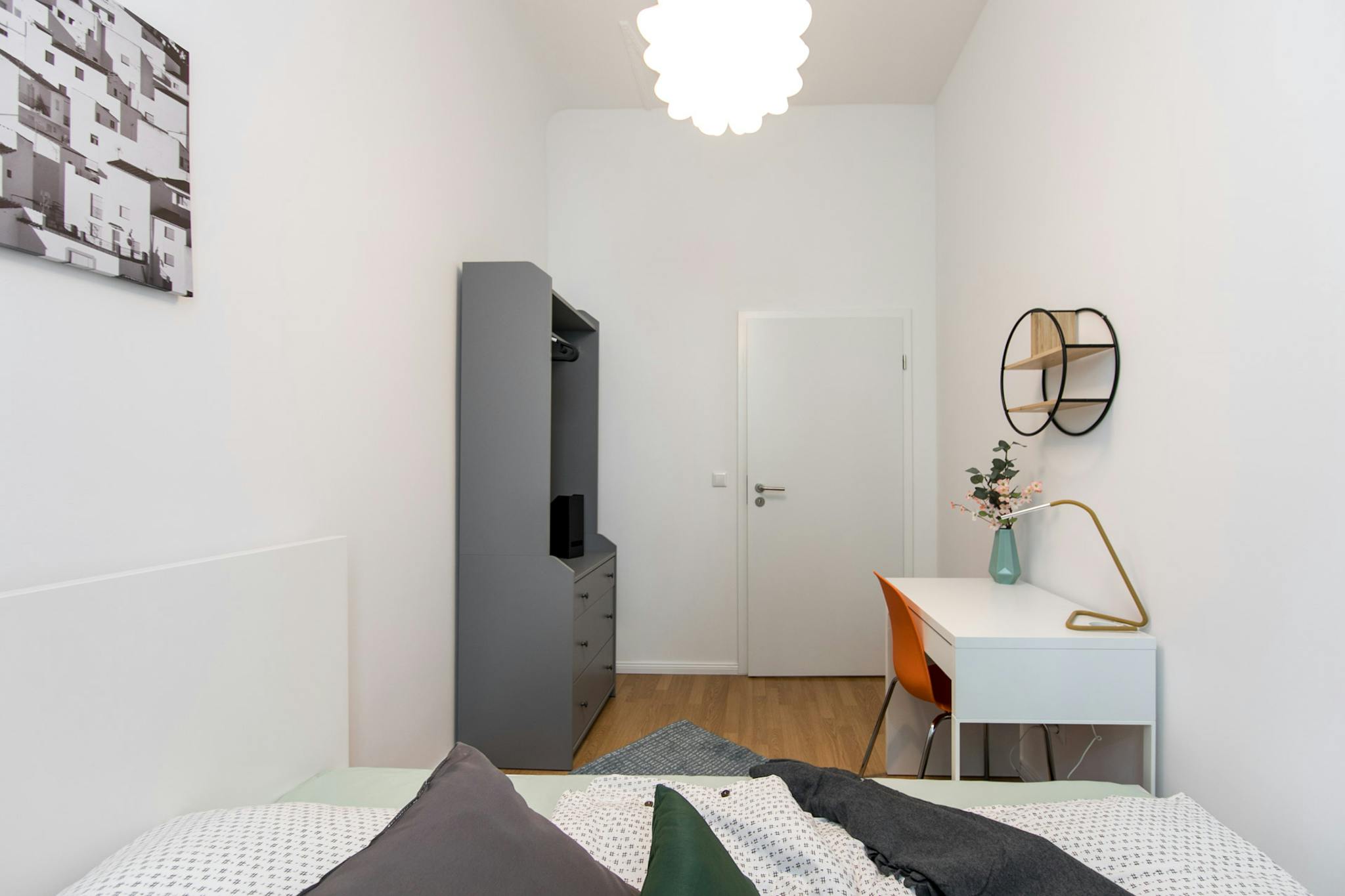this is a fully furnished room in a shared flat. The room has a comfortable bed, a desk with chair and a wardrobe for your clothes. Also the common areas are fully equipped with washing machine, cooking equipment and all you need for your daily living.