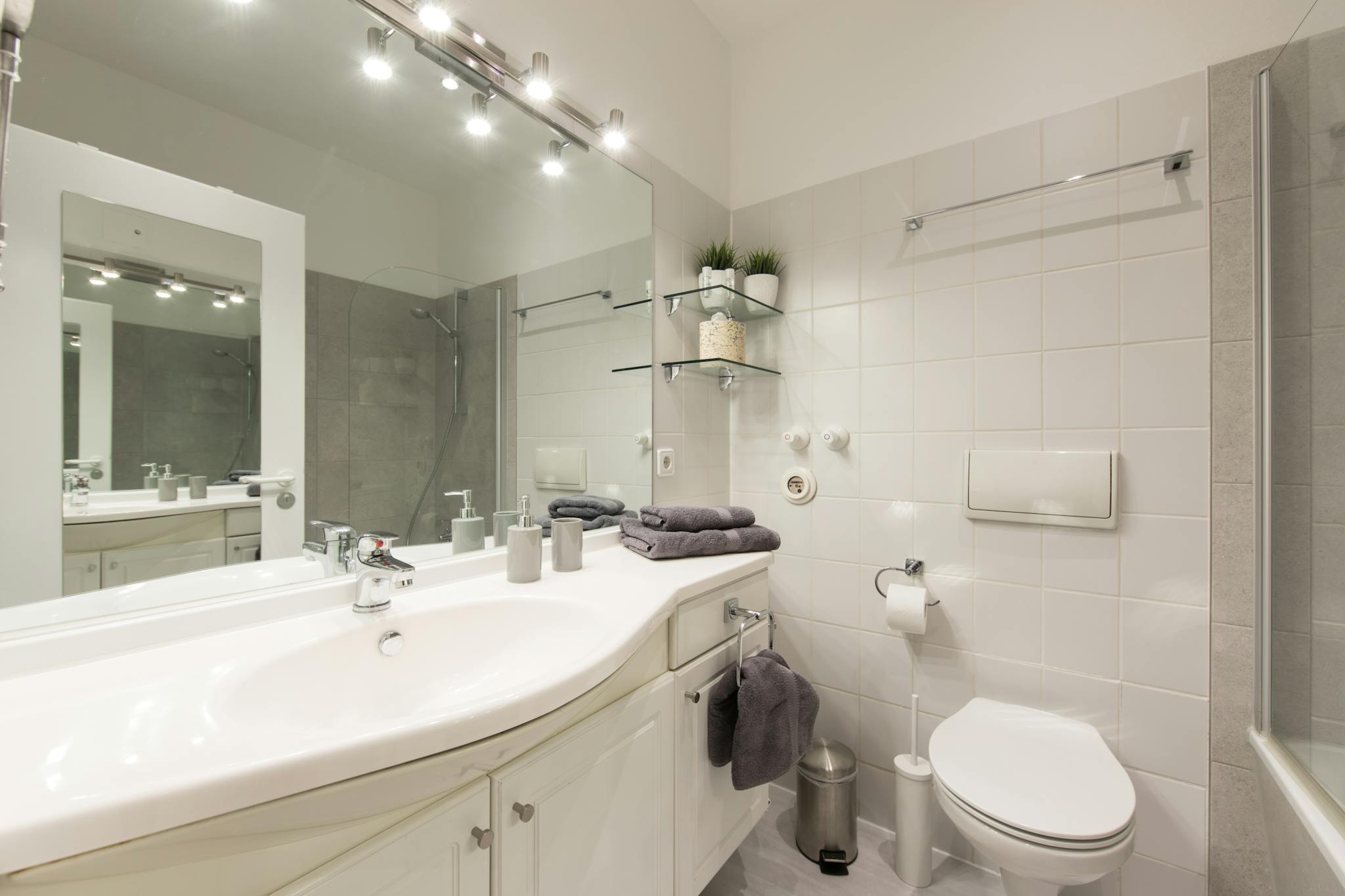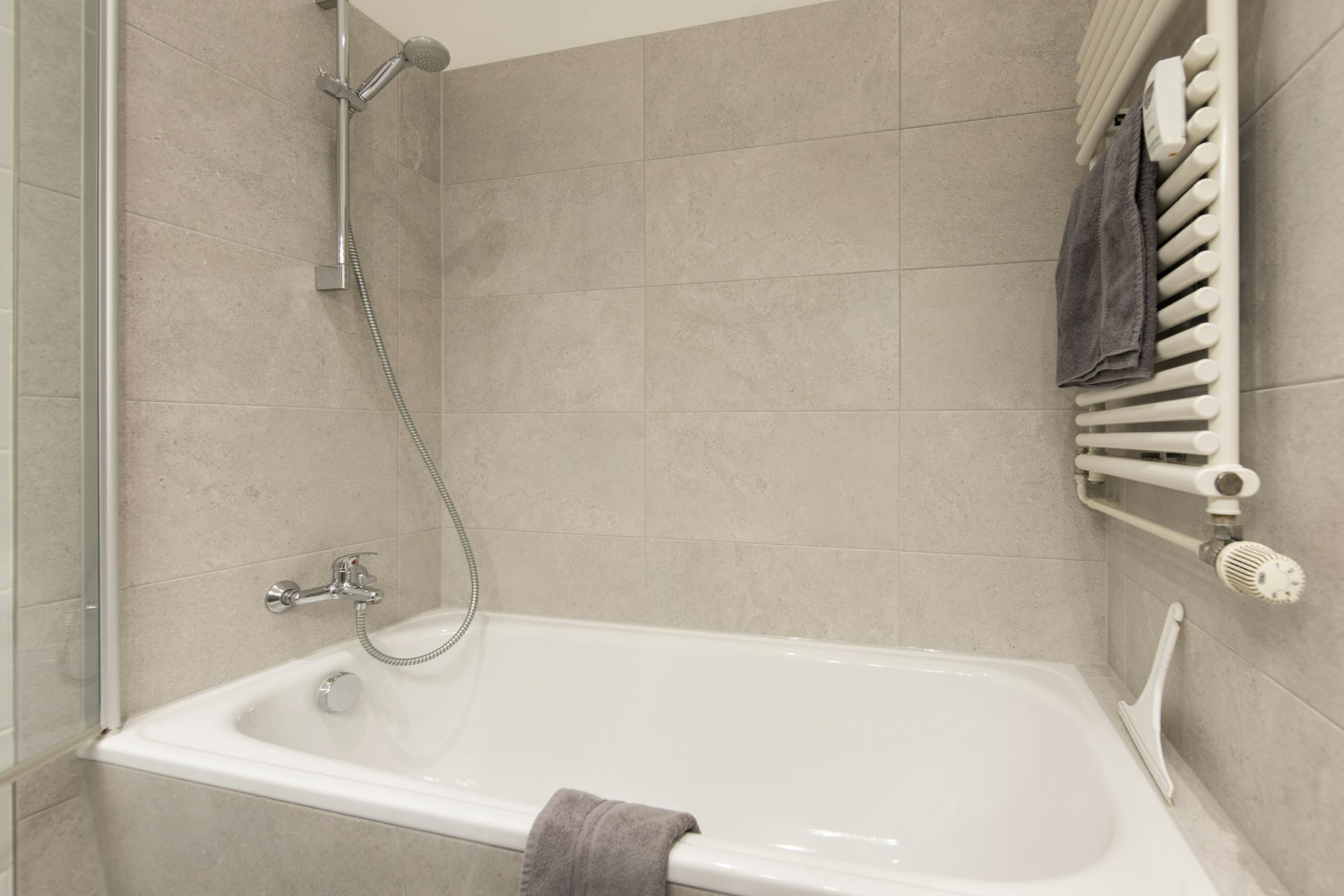 – bathroom with bathtub and glass shower screen, towels, hairdryer