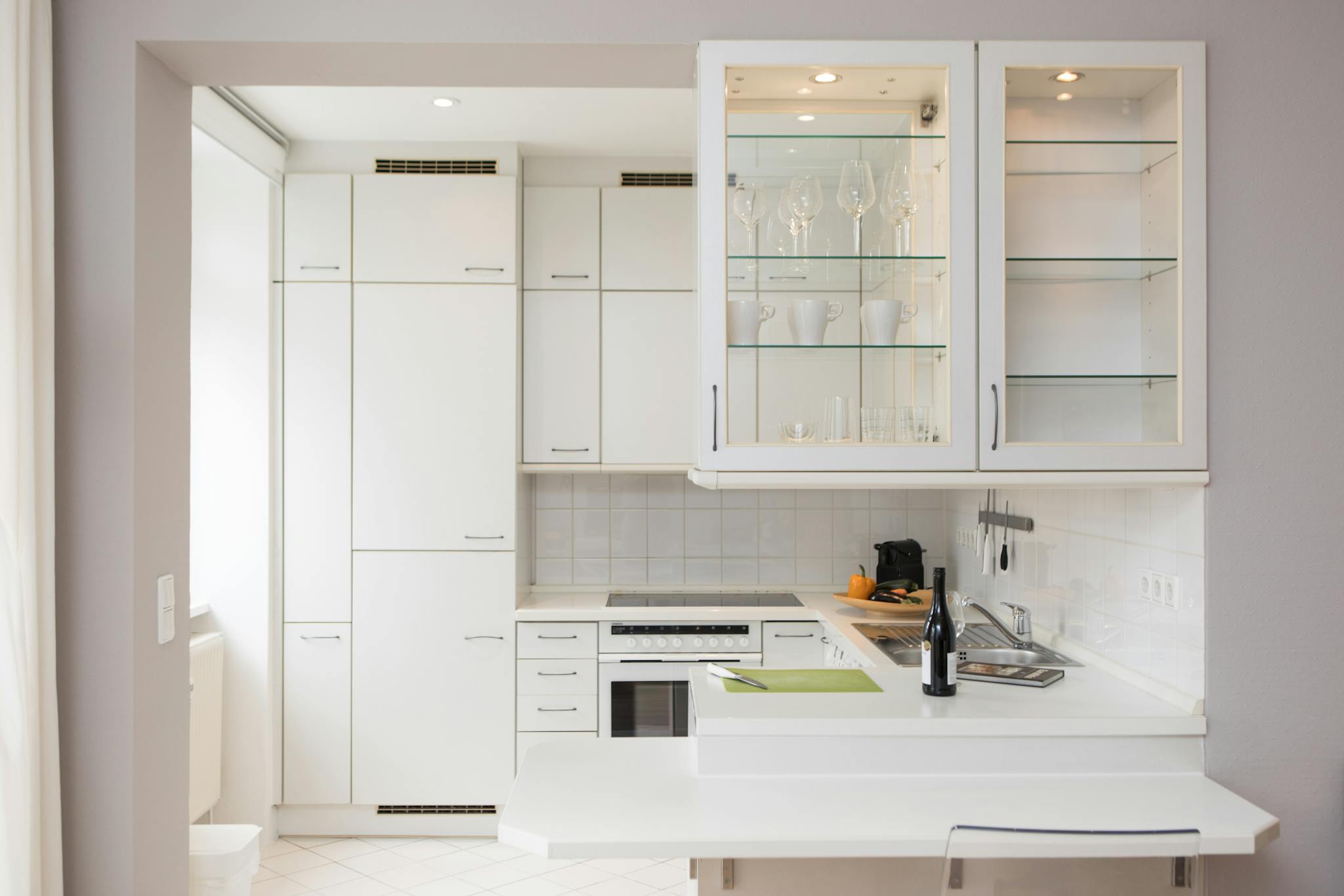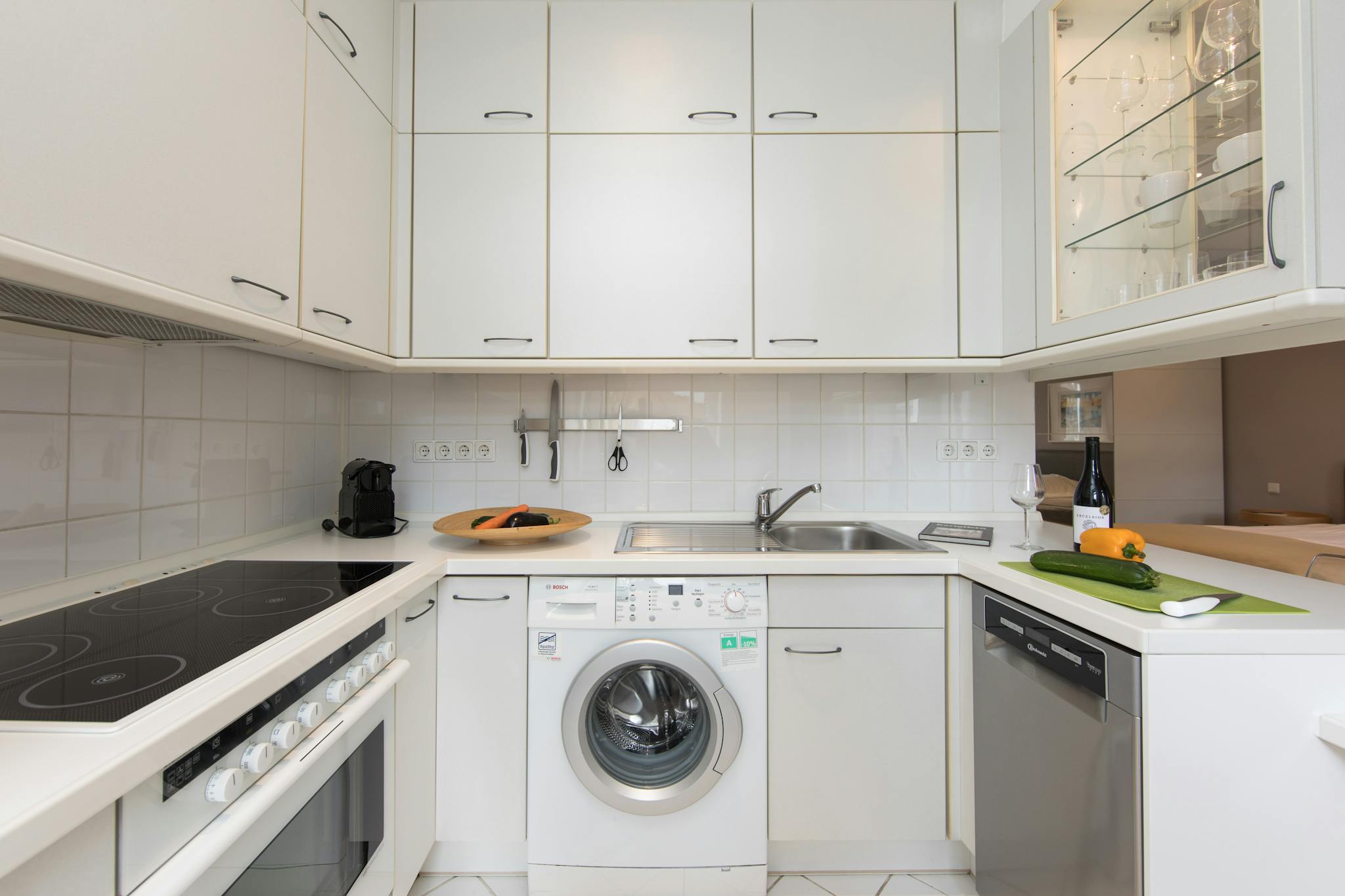 – offene Küche mit Ceranfeld/Backofen, Spülmaschine, Kühl/Gefrierschrank, Waschmaschine inkl. Trockner, Geschirr, Kochutensilien, Toaster, Wasserkocher, Nespresso-Maschine
