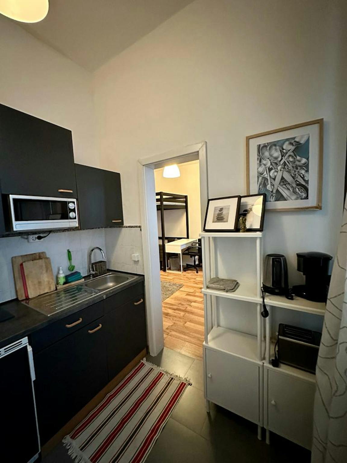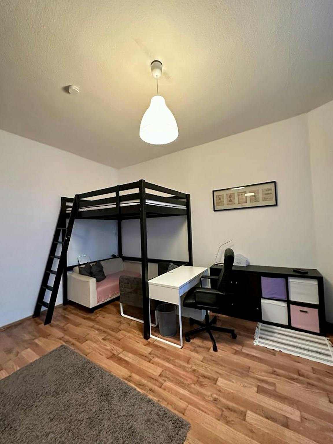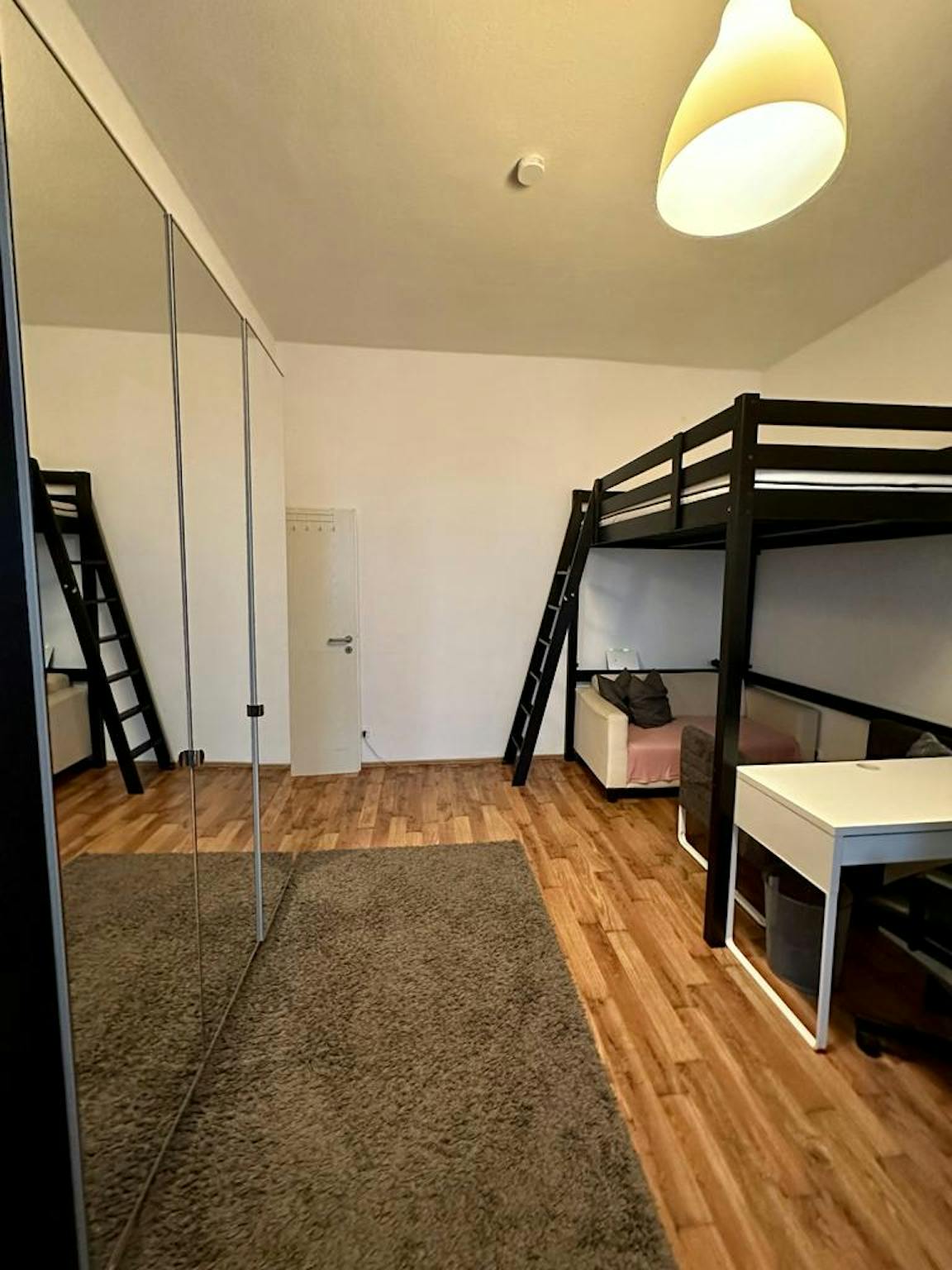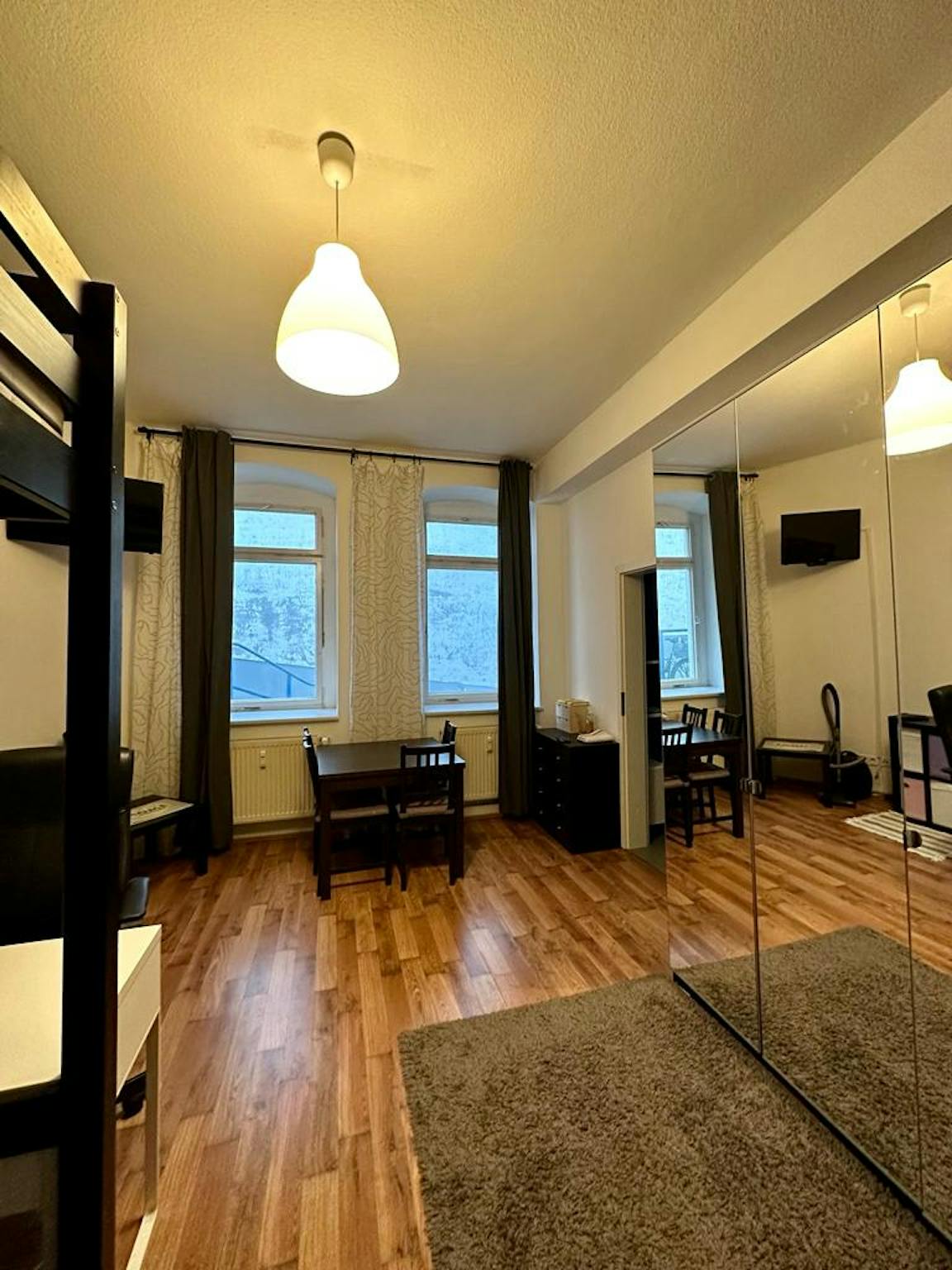 The apartment is full equipped with flat-rate internet, TV, vacuum, many spot lights and so on. In the kitchen there is a sofa, a small table, a hob, a microwave, a fridge with freezer as well as all cooking utensils, cutlery, cups and flatware you may need. In the room you have a loft bed which allows to use the whole space of the room and to watch TV while laying. There is a working desk with chair, one comfortable sofa, a large wardrobe, a set of drawers and a big table for many purposes. The colour "dark wood" can be found in many of the described items. In the bathroom there is a shower and a washing machine.