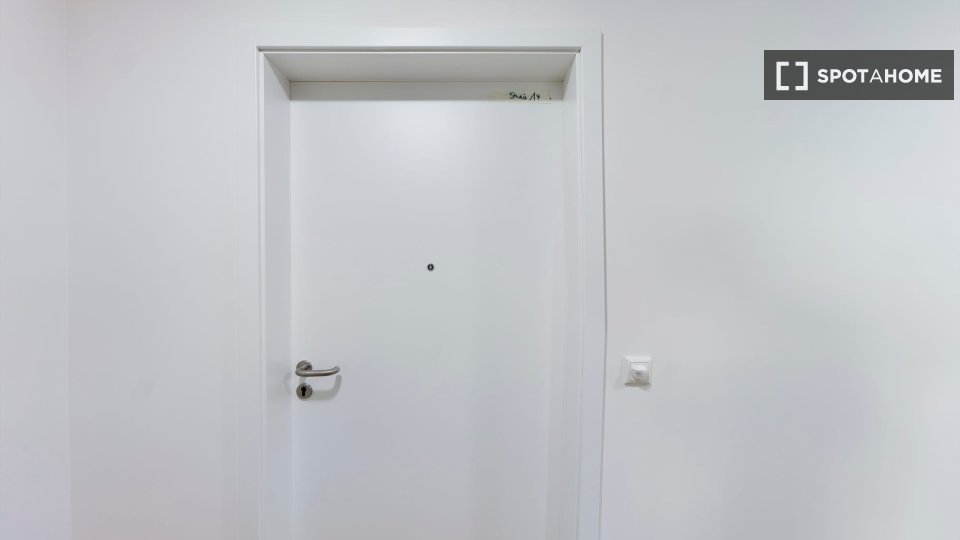 Shower, Mirror, Single bed (90x200), Wardrobe, Wardrobe, Cutlery, Pans & kitchen accessories, Fitted kitchen, Refrigerator, Microwave, Working desk, Vacuum Cleaner, Chairs