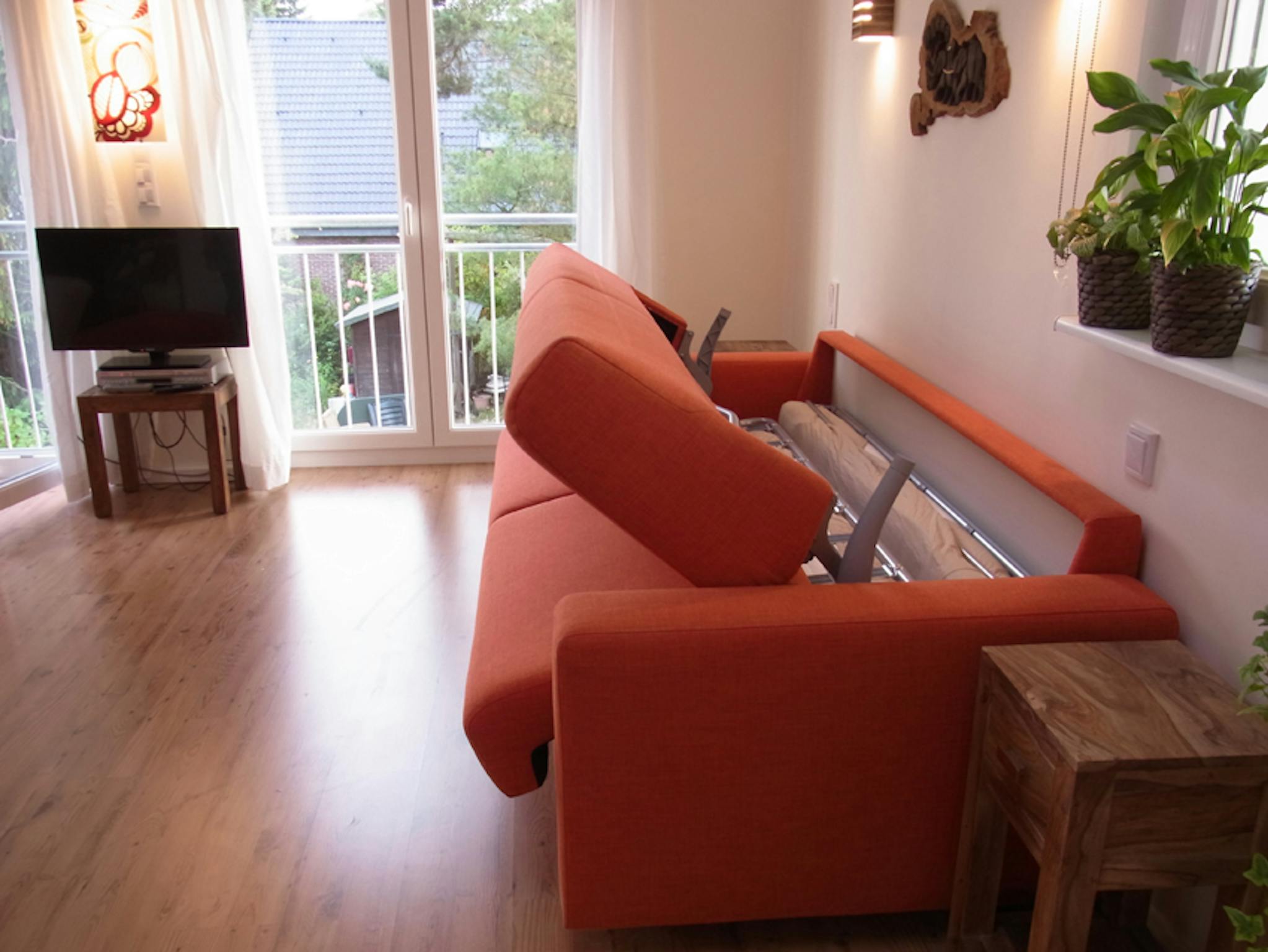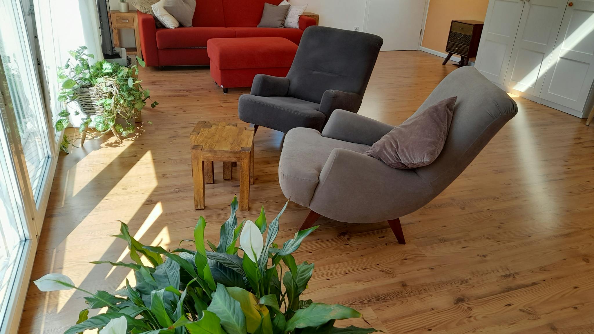 Eine bodentiefe Fensterfront und zwei Oberlichter sorgen für viel Helligkeit. Die Wohnung ist ausgestattet mit Einbauküche (Geschirrspüler, Kühlschrank mit Tiefkühlfach, Elektroherd mit Backofen, Kaffeemaschine, Toaster, Teekocher, Geschirr, Töpfe usw.), Wannenbad mit Akazienvollholzmöbeln, Abstellraum, Fußbodenheizung, Elektrojalousien, Waschtrockner (erneuert), Fernseher, Standventilator. Das sehr hochwertige Schlafsofa der Marke Messina mit enthaltener separater Matratze sorgt für Ihren erholsamen Schlaf (wurde 2023 erneuert). In den beiden Max Winzer Sesseln (wurden 2019 erneuert) lässt sich der Blick in den Himmel genießen oder Sie beobachten die Vögel, Katzen und Eichhörnchen in Garten und Bäumen. In den großen Kleiderschrank passen Ihre Sachen, Palisandertischchen und Esstisch geben der Wohnung eine gemütliche Atmosphäre. Aus der Filmbibliothek können Sie sich gerne Filme ausleihen. Den Garten dürfen Sie gerne mitbenutzen. Ein Stellplatz für Ihr Auto steht Ihnen auf dem Grundstück zur Verfügung. Aufgrund des Interesses meines Sohnes haben wir sehr schnelles Internet.