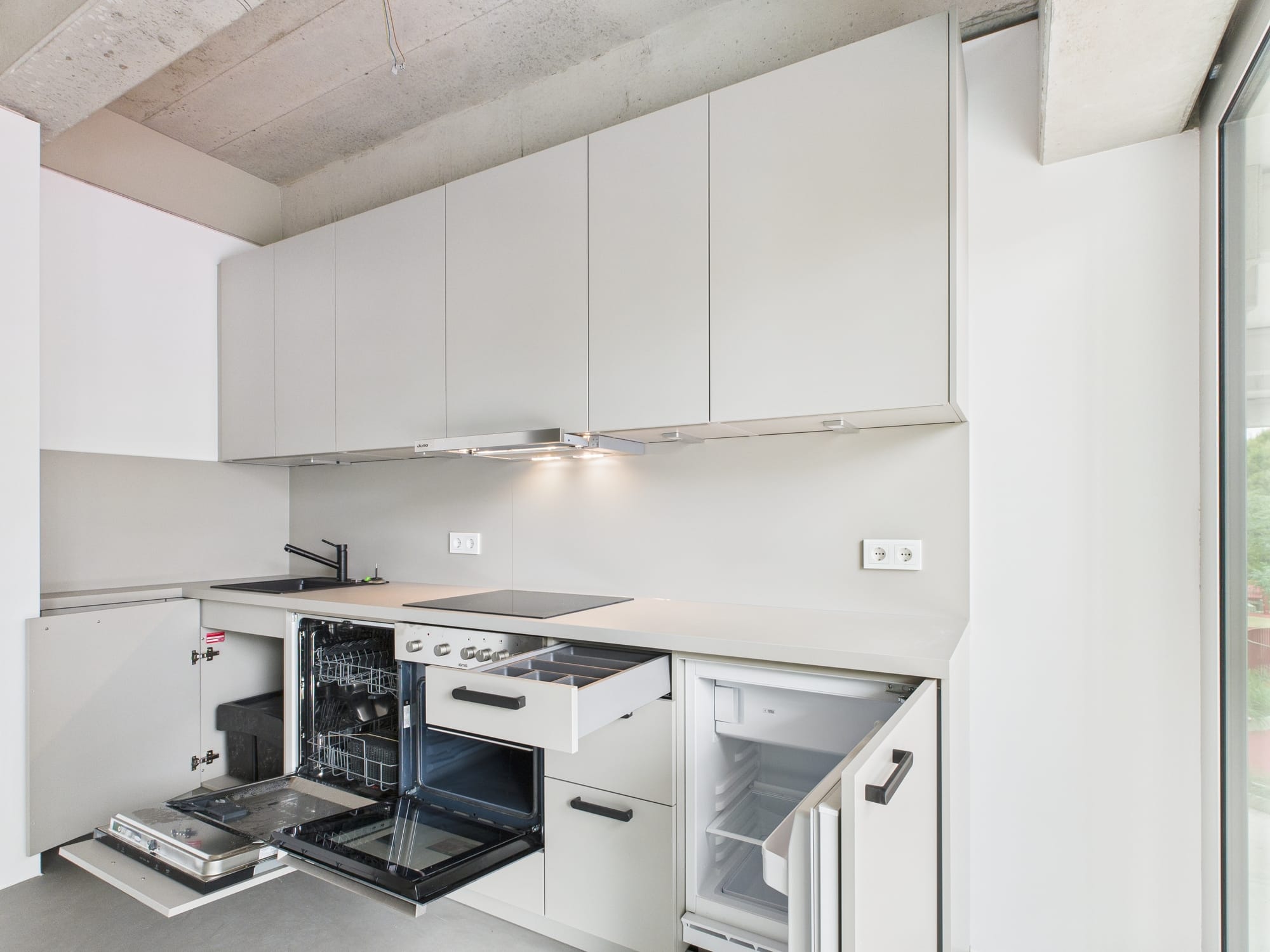 Shower, Mirror, Double Bed, Wardrobe, Curtain rods, Induction Stove, Fitted kitchen, Refrigerator, Dishwasher, Dining Table, Working desk, Chairs