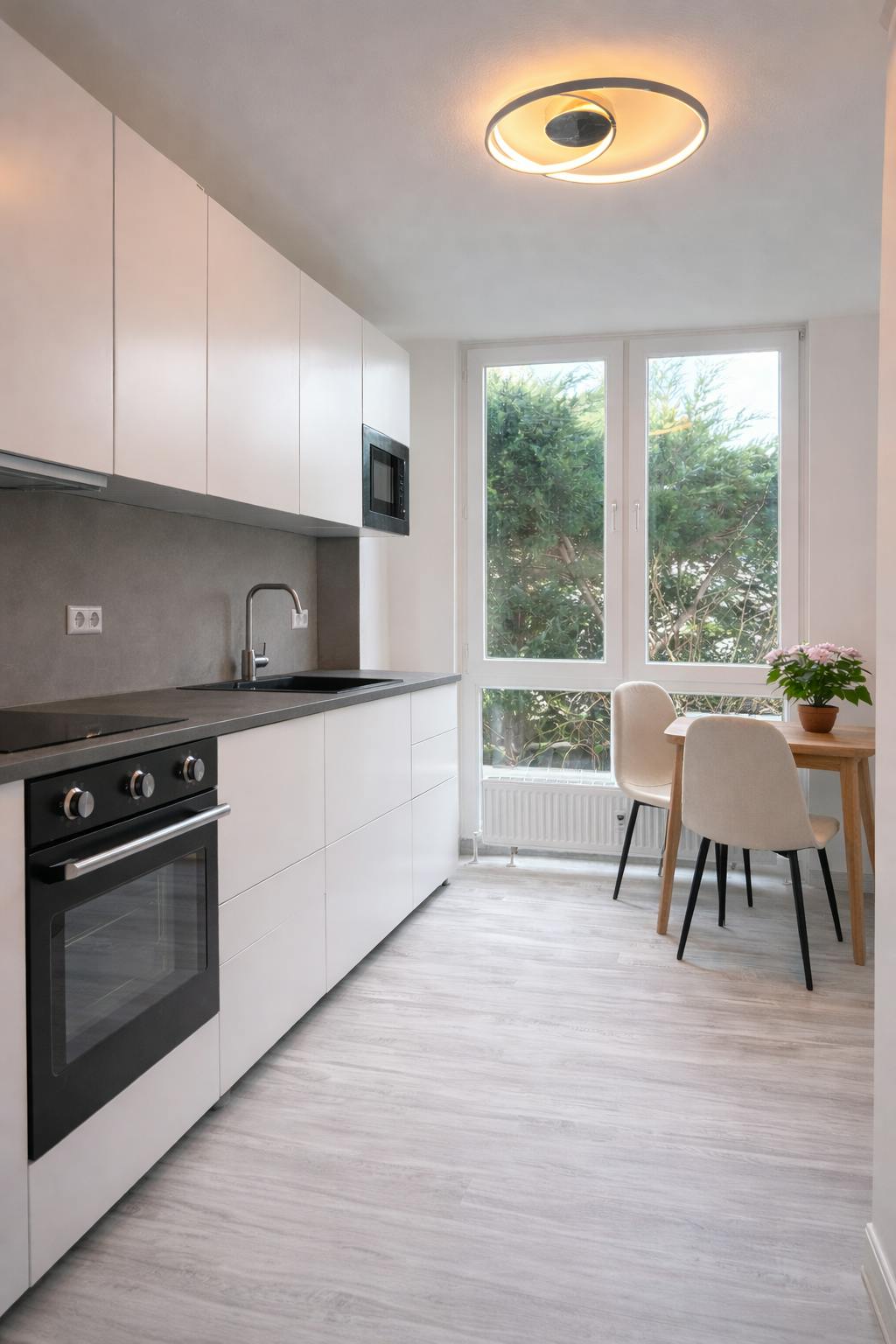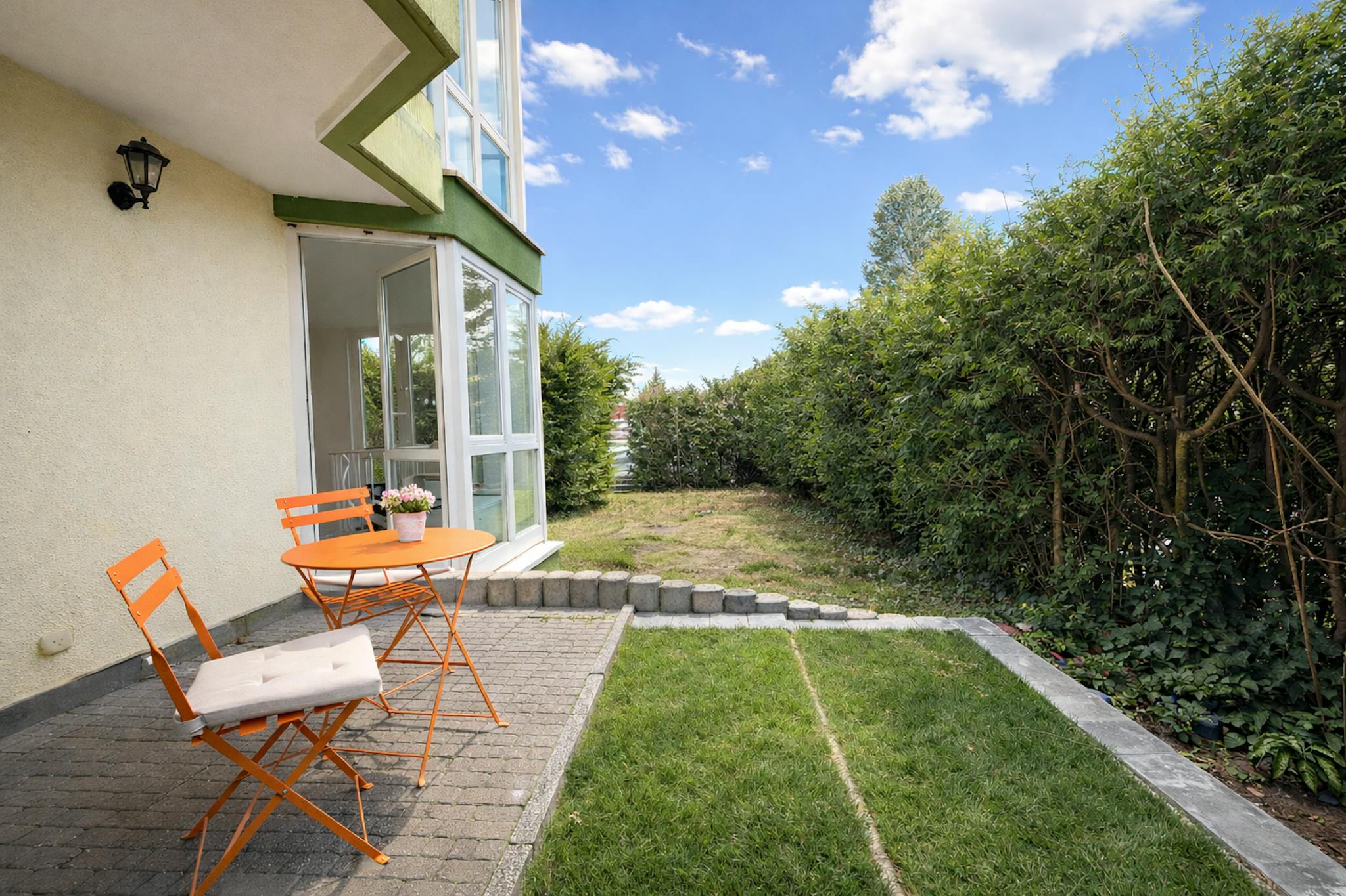 The bright living room with direct access to the terrace opens up to the garden and creates a calm, green living atmosphere. The apartment also includes a separate bedroom, a fully equipped kitchen and a modern bathroom.