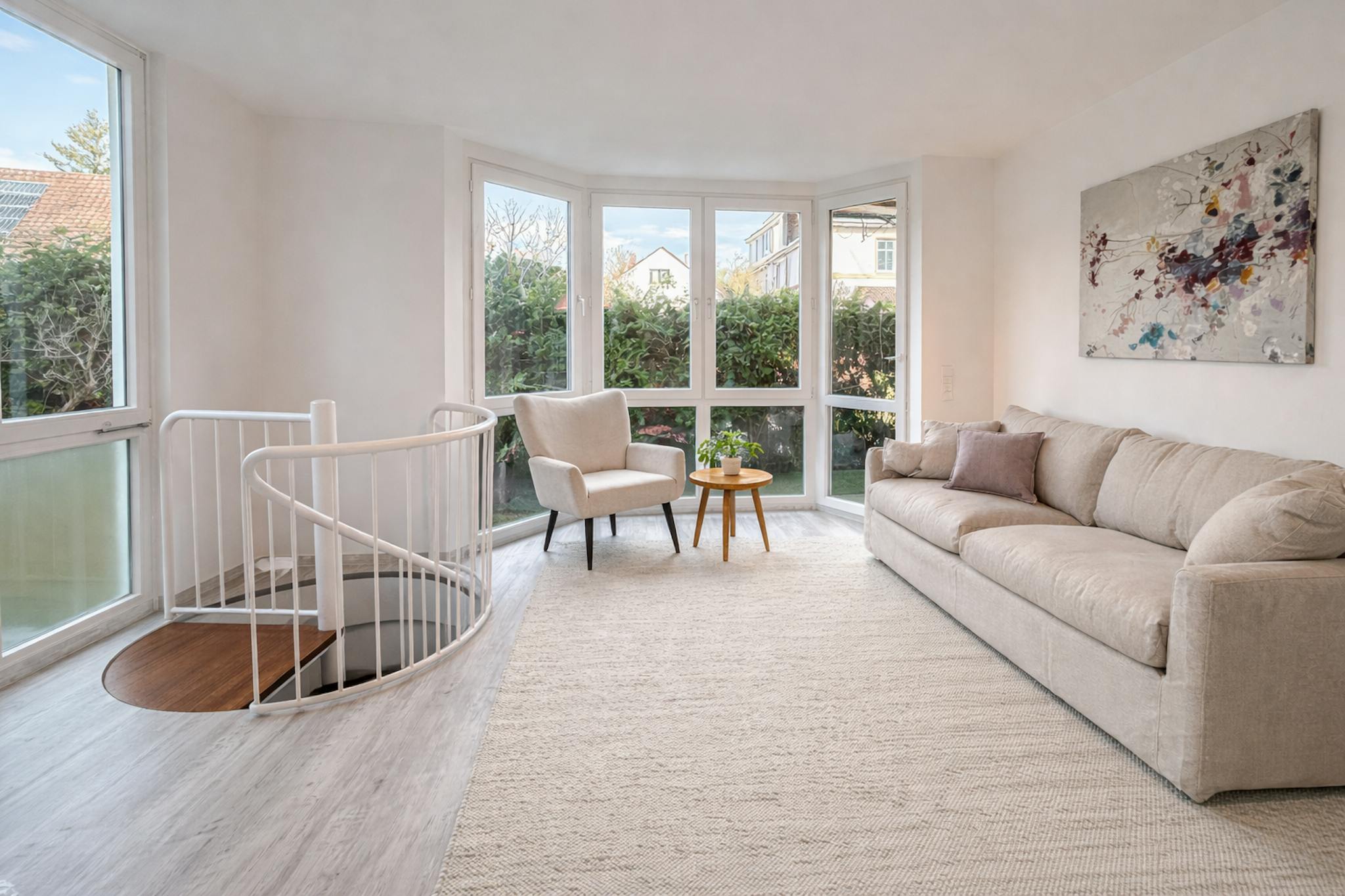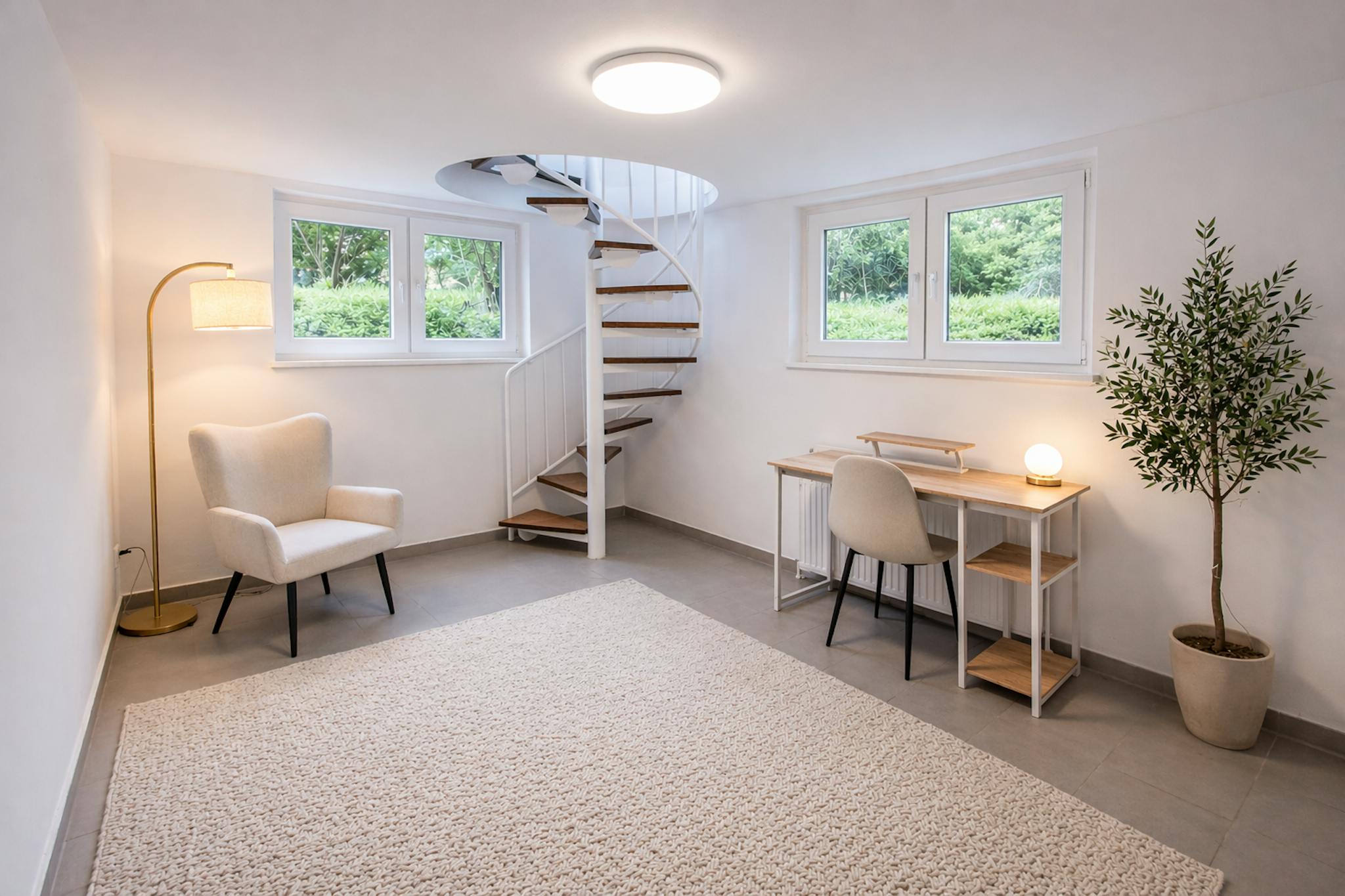 A spiral staircase leads to the souterrain level, which serves as an extension of the living space and can be used as a home office, guest area or hobby room, complemented by additional storage space.