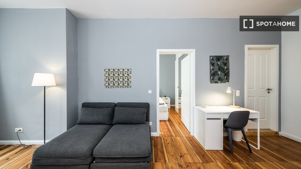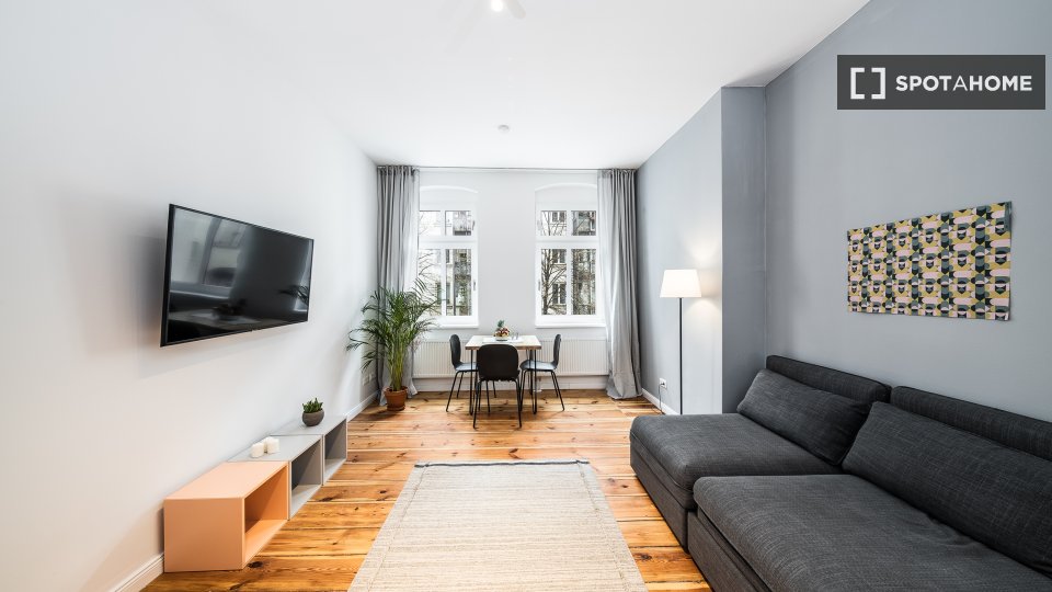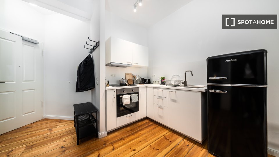 Pets allowedAllowedDiscover your next home—a fully furnished studio in Berlin's vibrant Friedrichshain-Kreuzberg area. This exceptional property welcomes professionals, couples, and students alike, offering a central heating system, a fully equipped kitchen including an oven, and a shared washing machine for convenience. A balcony or terrace enhances your living experience by providing a relaxing outdoor retreat. Furthermore, pets are allowed under certain restrictions, making it a perfect fit for animal lovers. All necessary bills—electricity, water, gas, and wifi—are included in the rental.