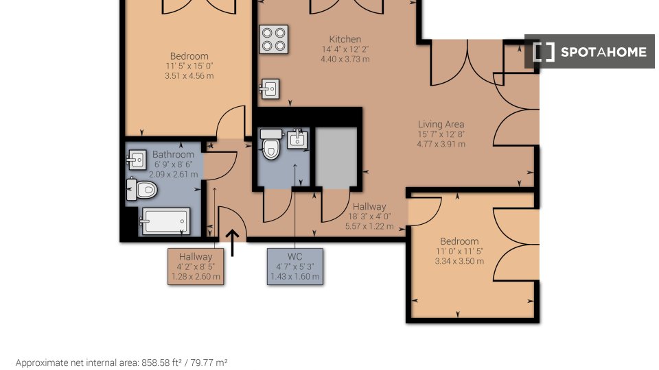 2 Bedrooms - 1 Master & 1 kids/guest room. Living area & dining area are split with a semi-partitioned wall. The apartment has a master bath & also a small guest toilet.