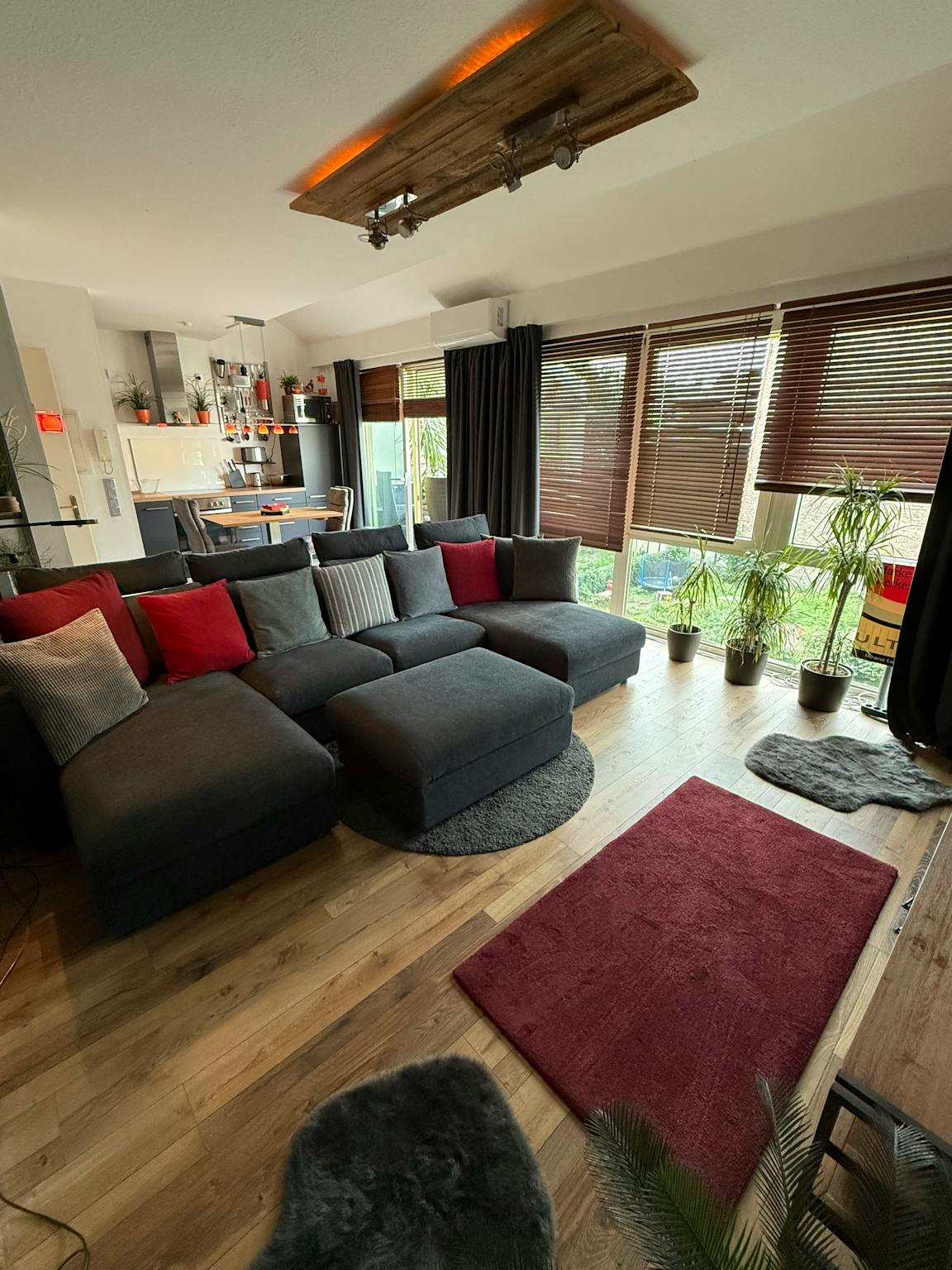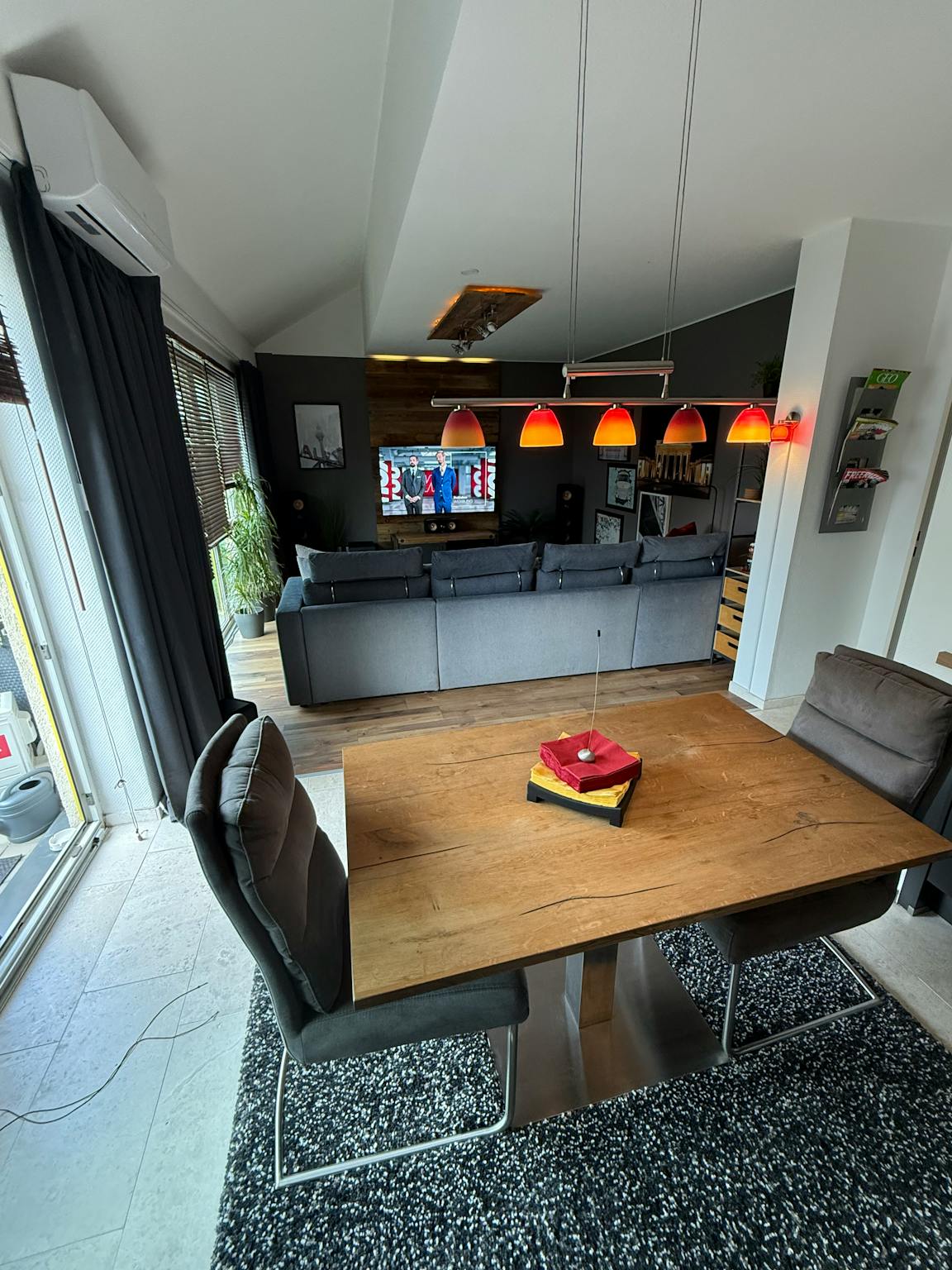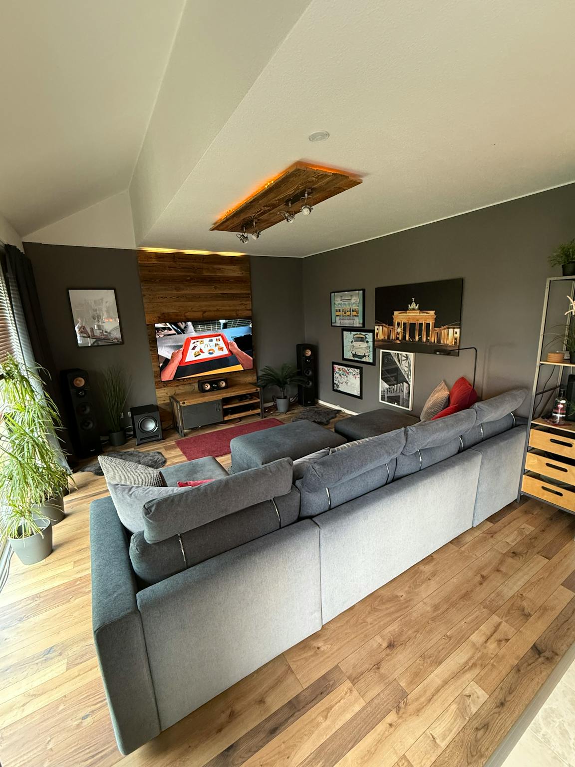 Im Wohnzimmer mit offener Küche sorgt ein großes Sofa in U-Form für Gemütlichkeit und Entspannung. Mit dem neuen 55-Zoll Smart-TV kannst du deine Lieblingsdienste streamen. Auf Wunsch gerne mit dem Service „Magenta-TV“.