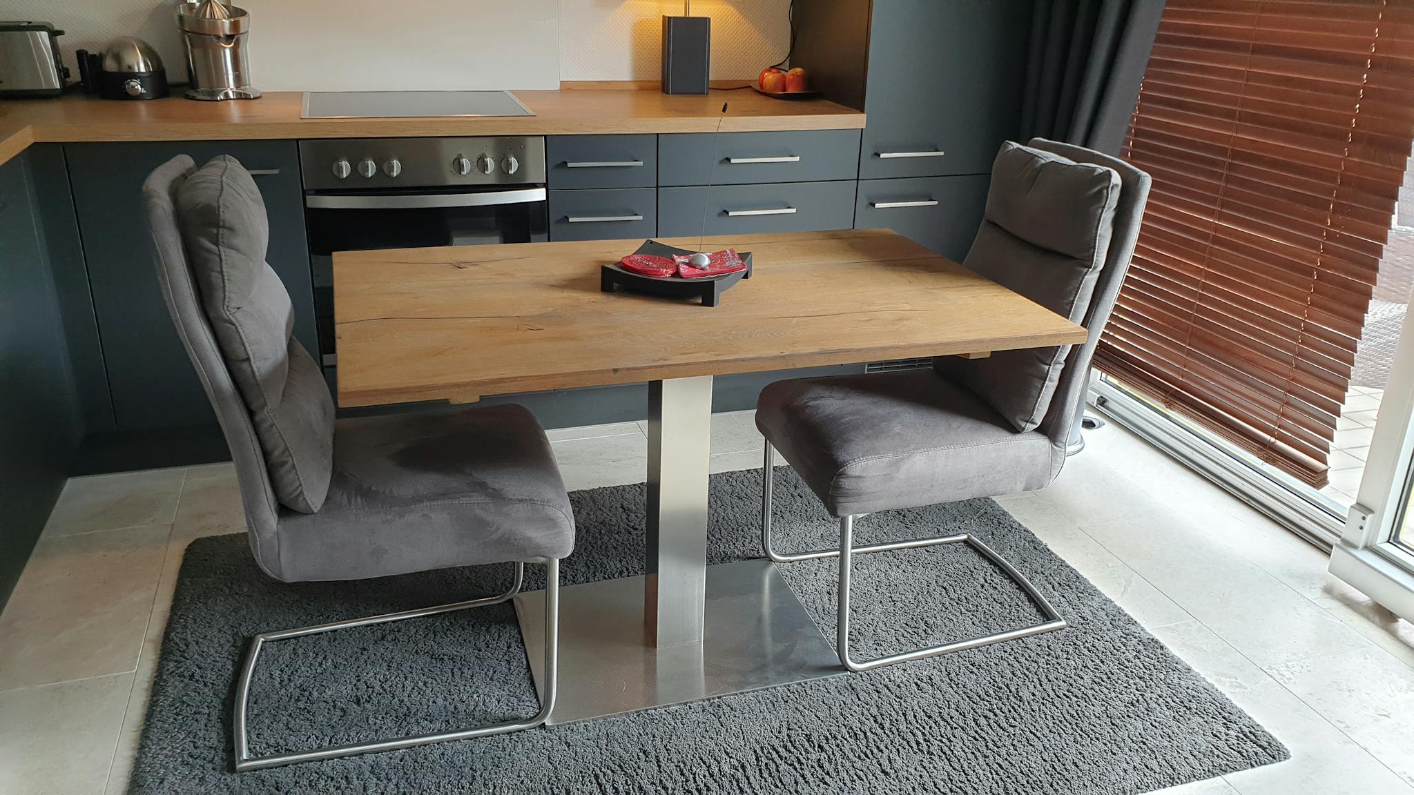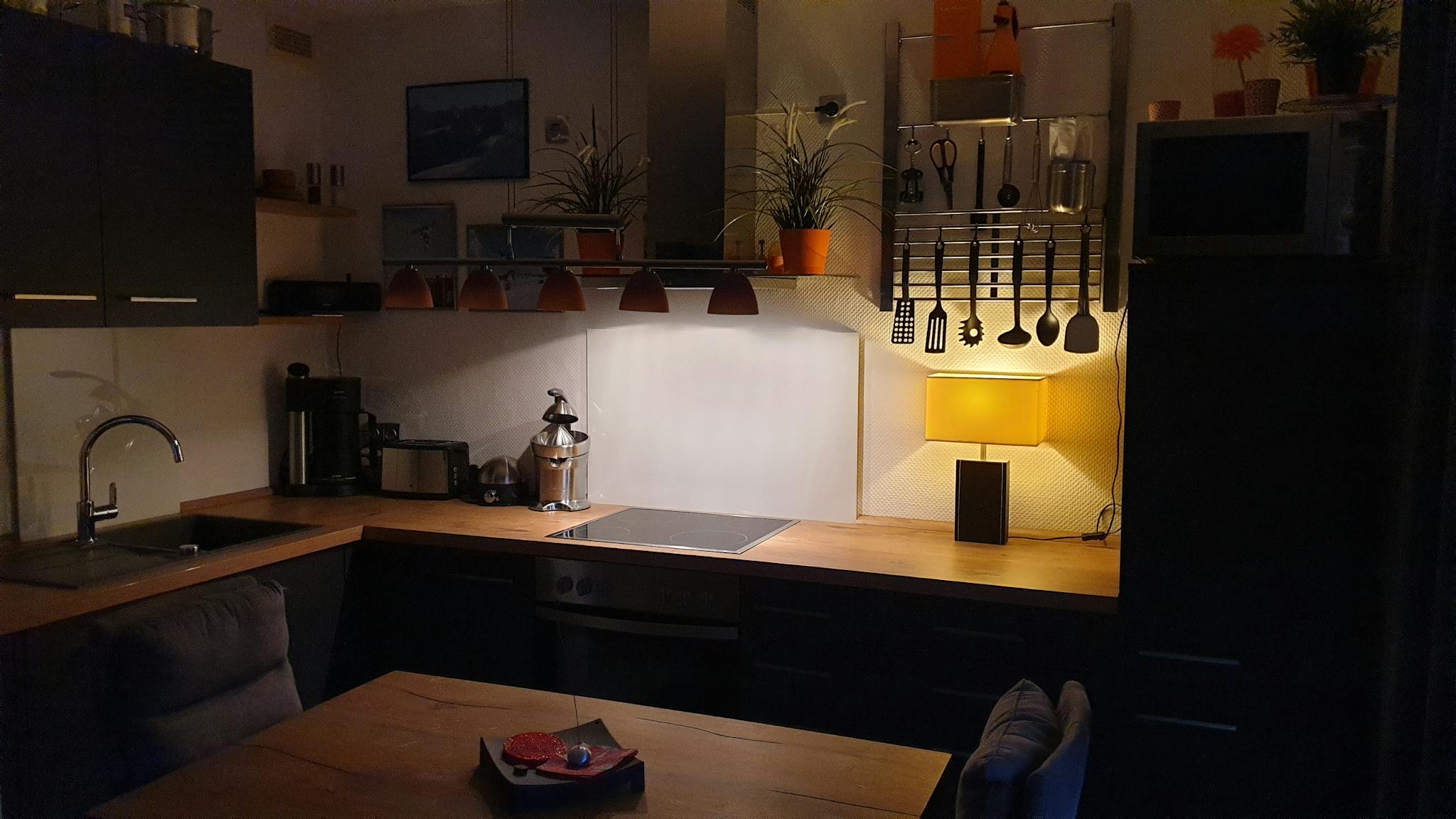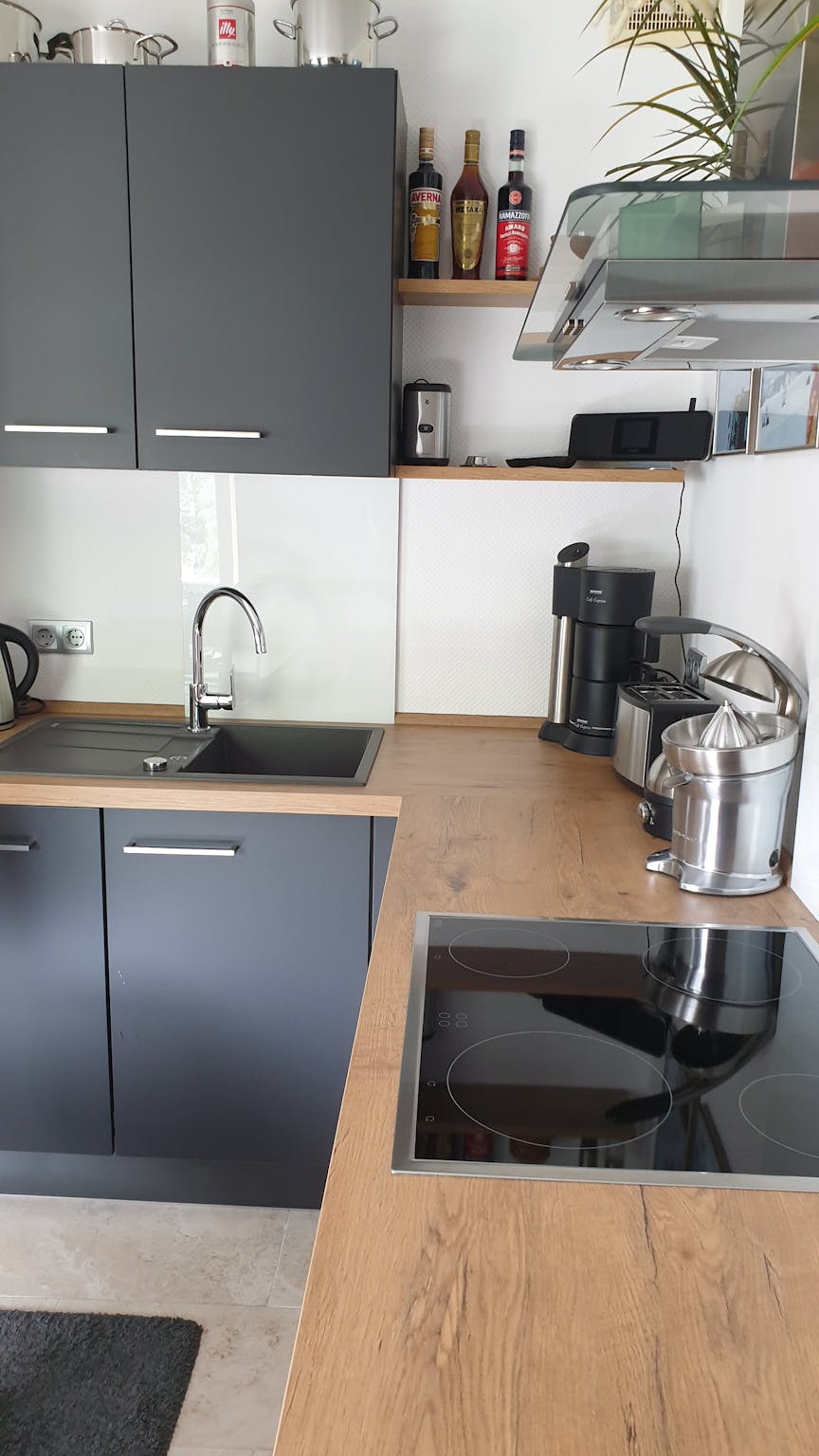 In der hochwertigen Einbauküche in L-Form findest du sämtliche Utensilien, die du zum Kochen benötigst. Wasserkocher, Kaffeemaschine (auf Wunsch Kaffee-Automat)