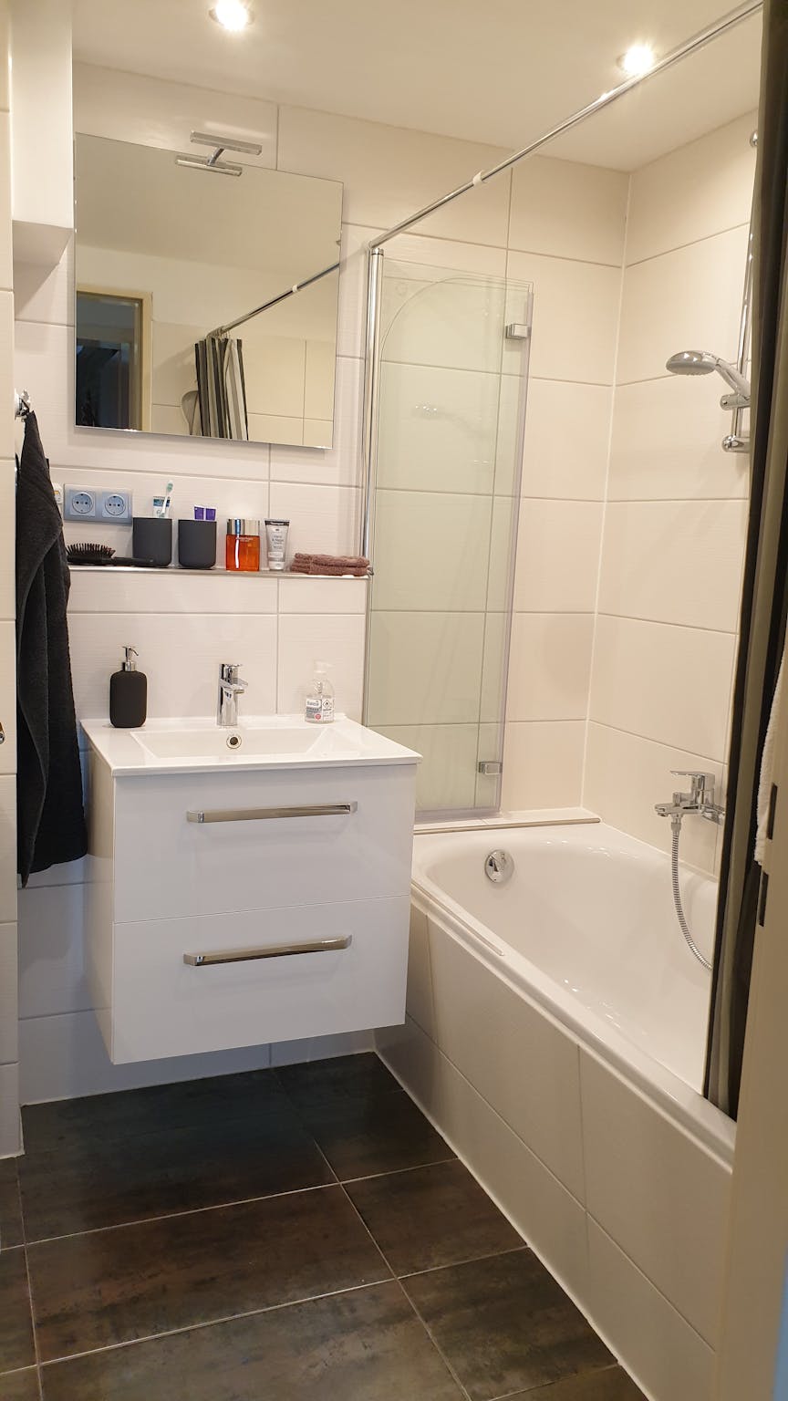 Im Badezimmer kannst du ein entspanntes Bad genießen oder mit der Dusche für Frische und Sauberkeit sorgen. Eine kleine Waschmaschine findet ebenfalls im Bad seinen Platz.