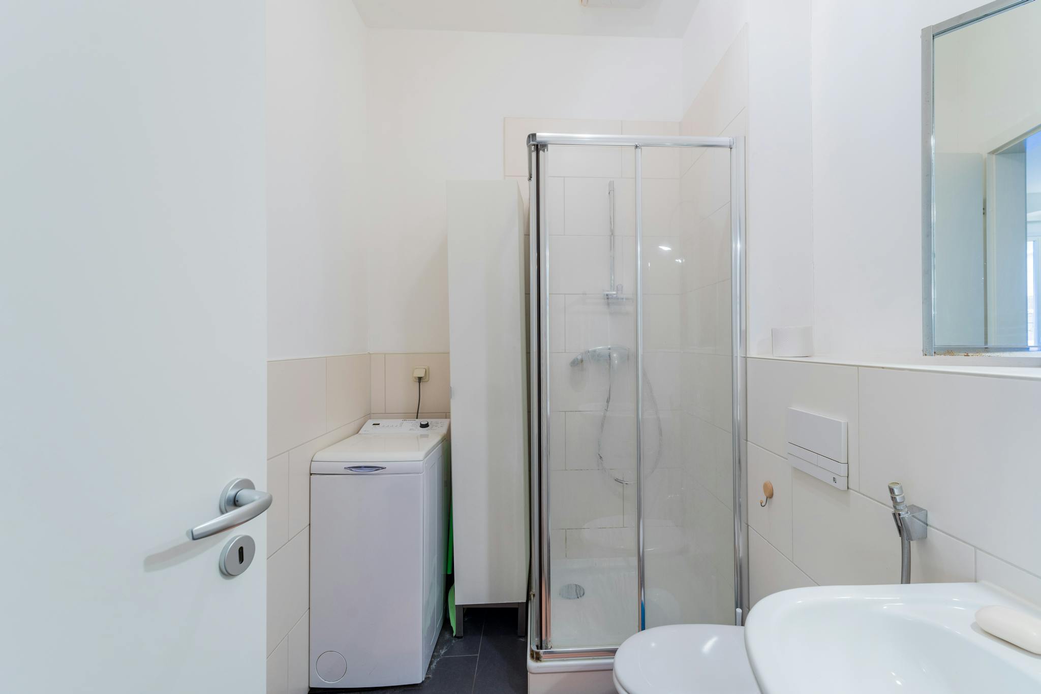 🚿Bathroom: The modern bathroom includes a shower, toilet, mirror, and sufficient storage space for toiletries and a washbasin. Towels and a hairdryer are provided. A washing machine is also available for free use. 🧴🧺