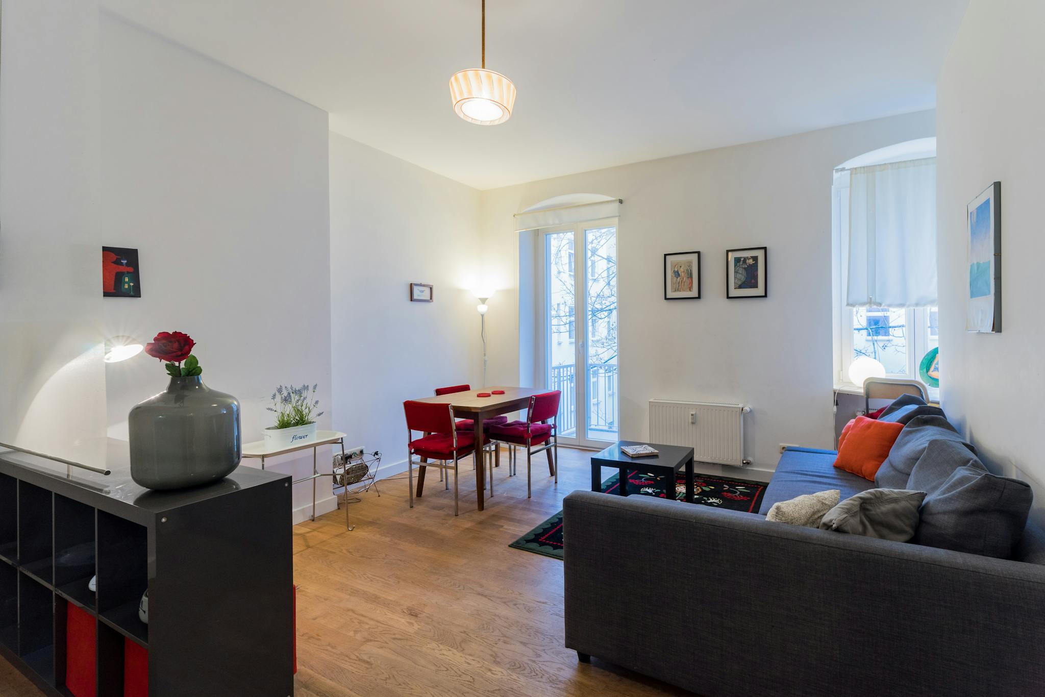 🛋️Living and Sleeping Area: The space features gorgeous dark parquet flooring, while the bathroom is tiled. The spacious living room boasts a large, multi-piece couch, a patterned carpet, and a black coffee table. High windows flood the rooms with natural light, creating a warm and cozy atmosphere. The room is adorned with numerous pictures, a floor lamp, a shelf, and a practical dining table with three vibrant red chairs. 🖼️✨