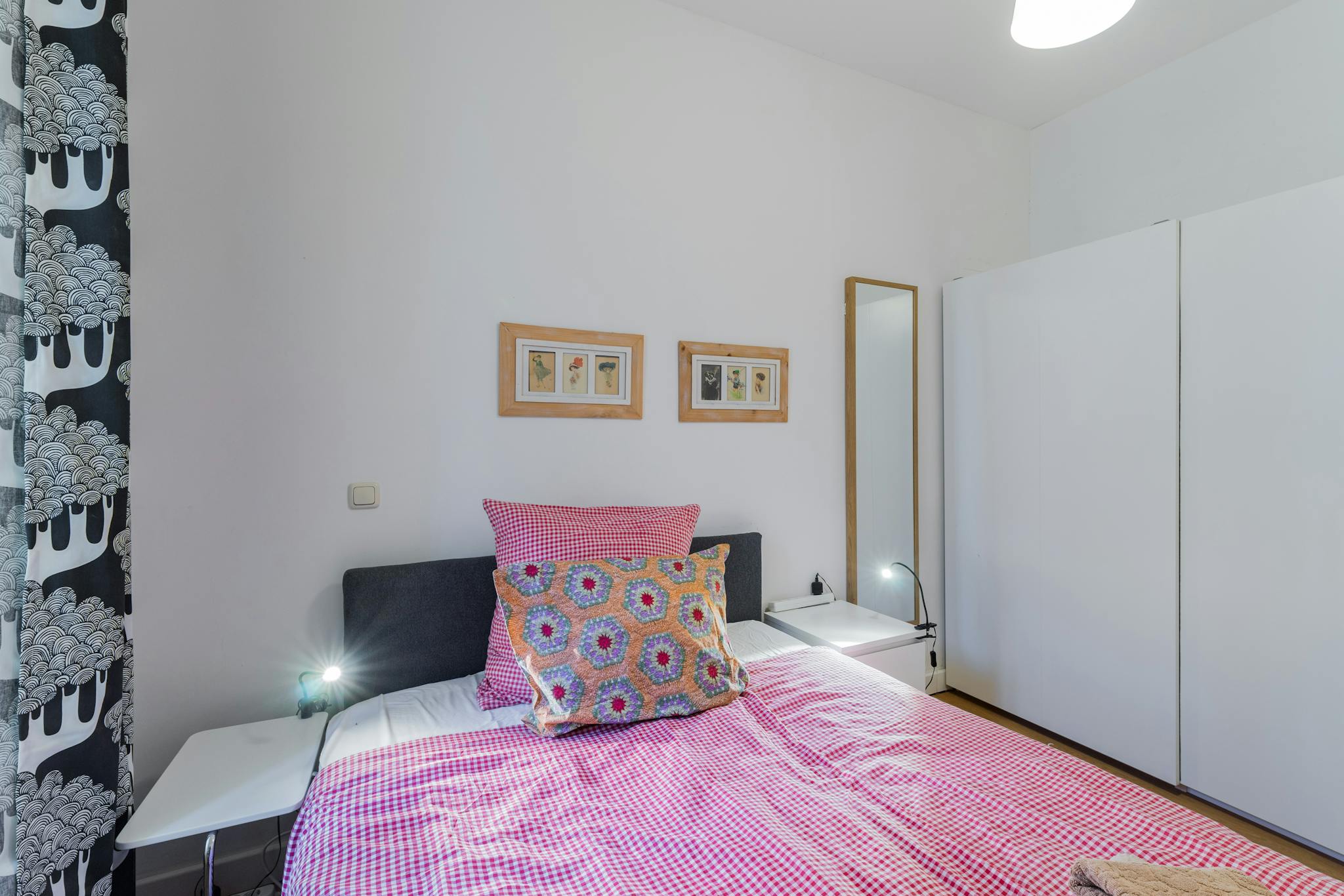 🌙Bedroom: A large double bed awaits the two tenants, complemented by a shelving unit and a spacious wardrobe for ample storage. The room also features a tall mirror, bedside cabinet with lamp, and lovely decorations. 🛏️🗄️