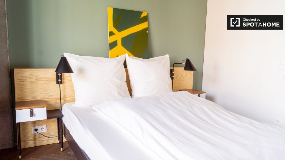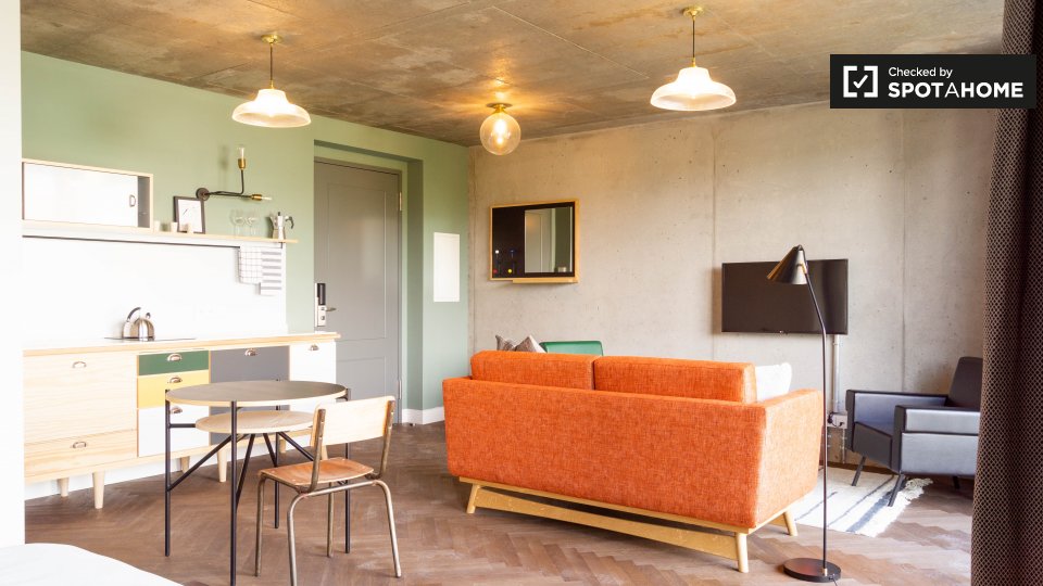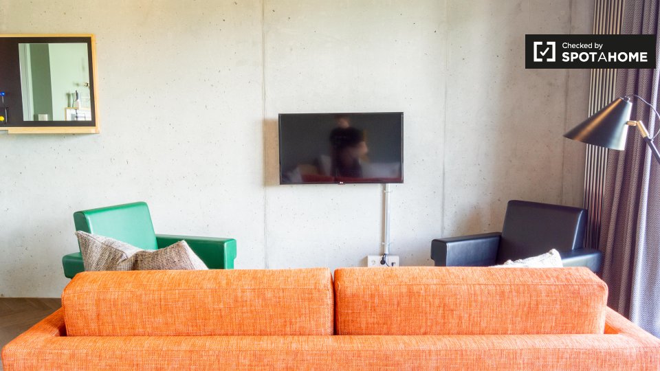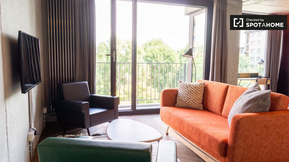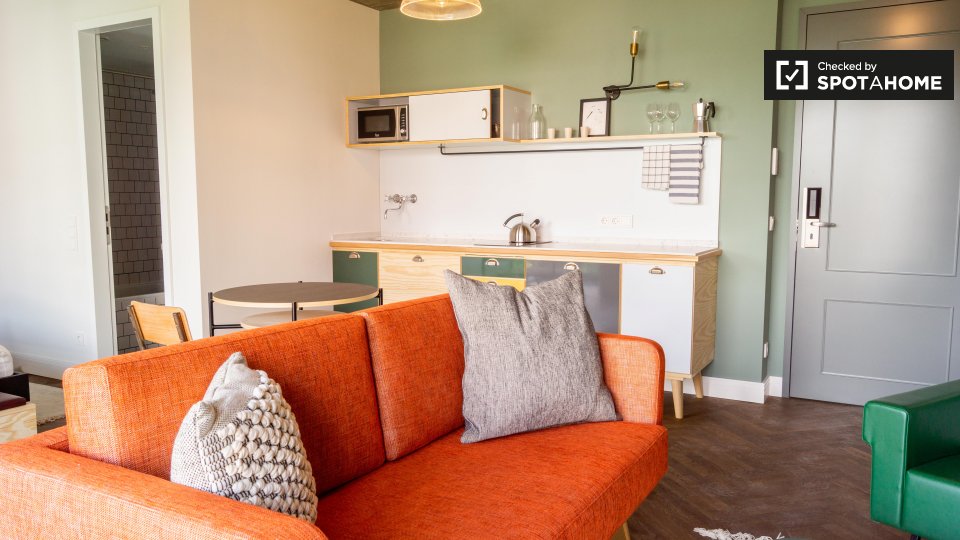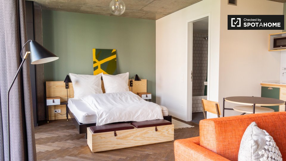 Pets not allowedNot allowedThis cool studio apartment to rent on Brunnenstraße is located in Mitte, Berlin. It has a retro mid-century decor, which is very mod, but also comfortable. The living area has a sofa and 2 armchairs, as well as a TV, and a glass door to a small balcony. The bathroom is modern with a tub, and the kitchen is fully equipped. The sleeping area is furnished with a double bed, storage chest, and night tables. There is a desk facing a large window, and there is a wardrobe for your clothing.