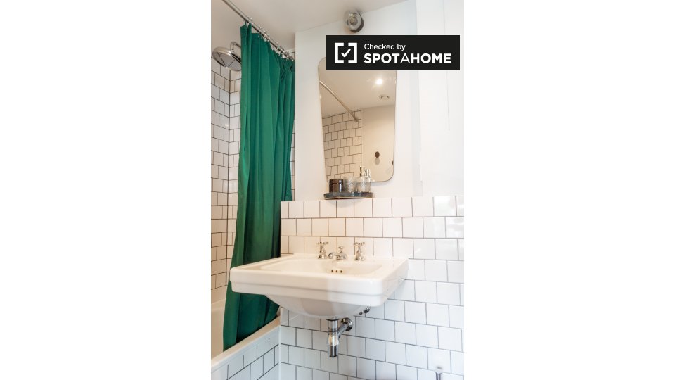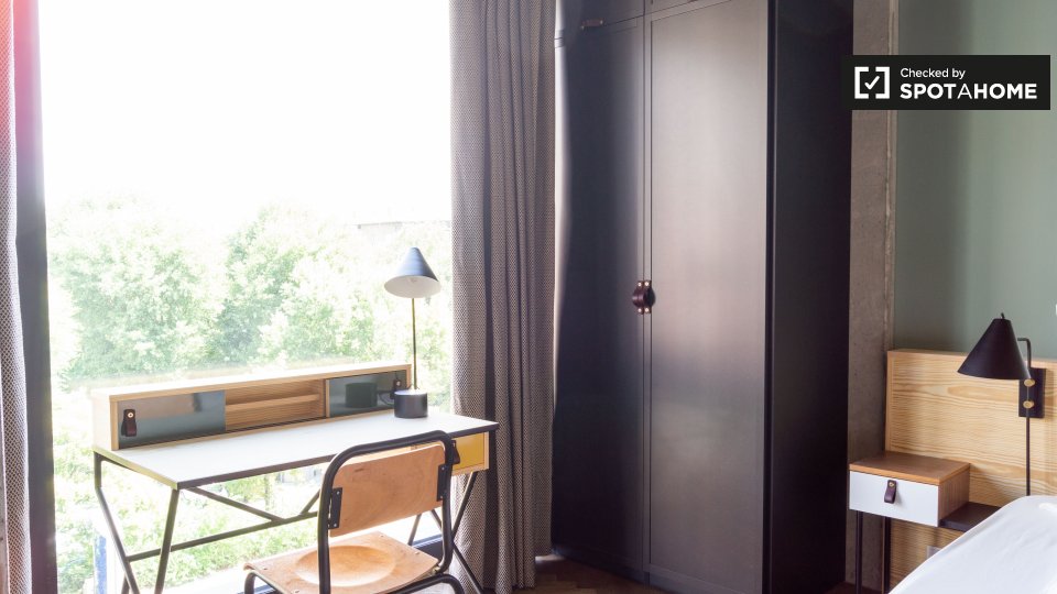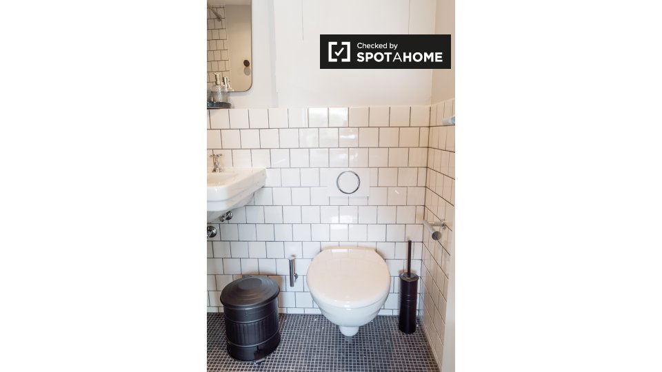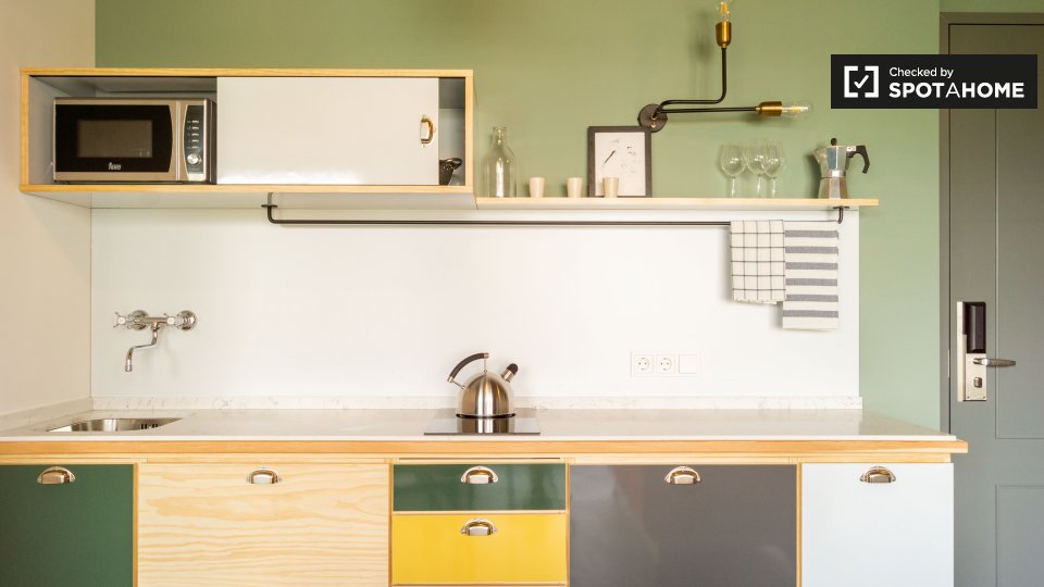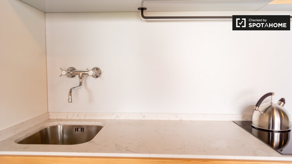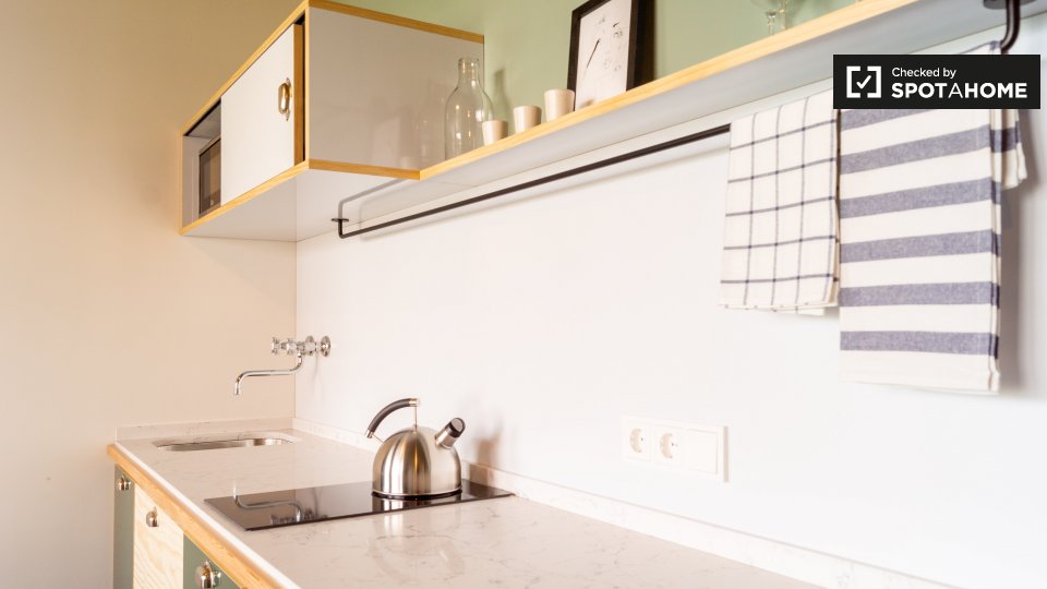 Pets not allowedNot allowedThis cool studio apartment to rent on Brunnenstraße is located in Mitte, Berlin. It has a retro mid-century decor, which is very mod, but also comfortable. The living area has a sofa and 2 armchairs, as well as a TV, and a glass door to a small balcony. The bathroom is modern with a tub, and the kitchen is fully equipped. The sleeping area is furnished with a double bed, storage chest, and night tables. There is a desk facing a large window, and there is a wardrobe for your clothing.