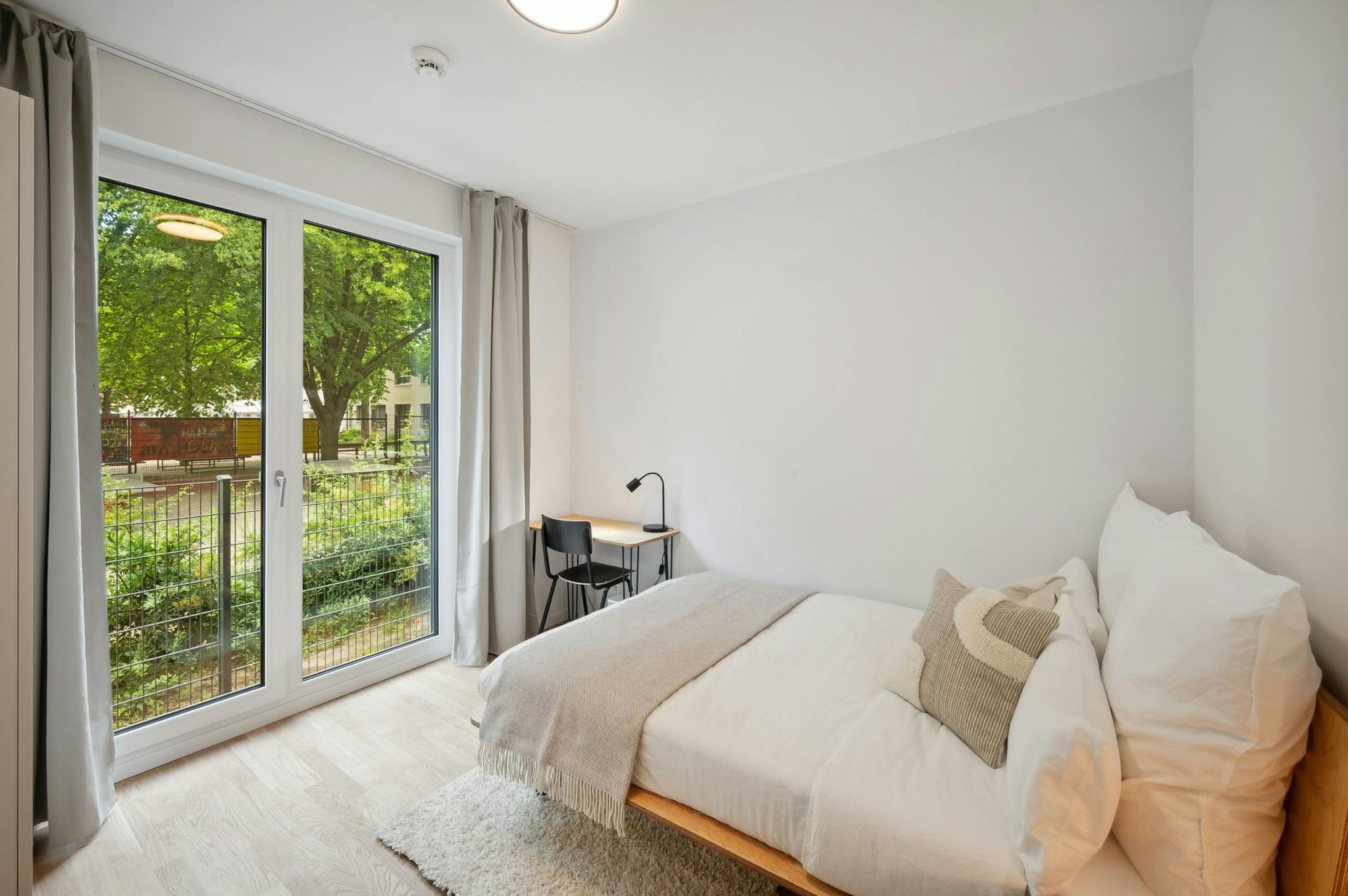 Our rooms come fully furnished with everything you need for a comfortable daily life. In the bedroom area, you will find a bed with a nightstand and lamp, as well as a large wardrobe. A premium mattress with a set of bedsheets, pillows, and duvets is also always included. To comfortably work or study from home, there is a table with a lamp and chair. You wont need anything additional to settle in, and can arrive just your luggage at hand.