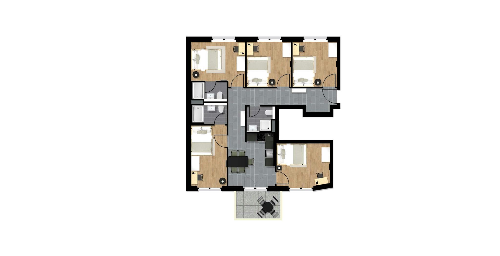 You will be the first to move into our newly constructed and renovated apartments with complete noise isolation and floor heating. Each flat has a fully equipped modern kitchen with everything from pans to a coffee machine, dishwasher, and oven. To catch those sun rays, ground-floor apartments have terrace access facing the courtyard, while flats on other floors include balconies. All apartments have spacious bathrooms that you will be sharing with your flatmates.