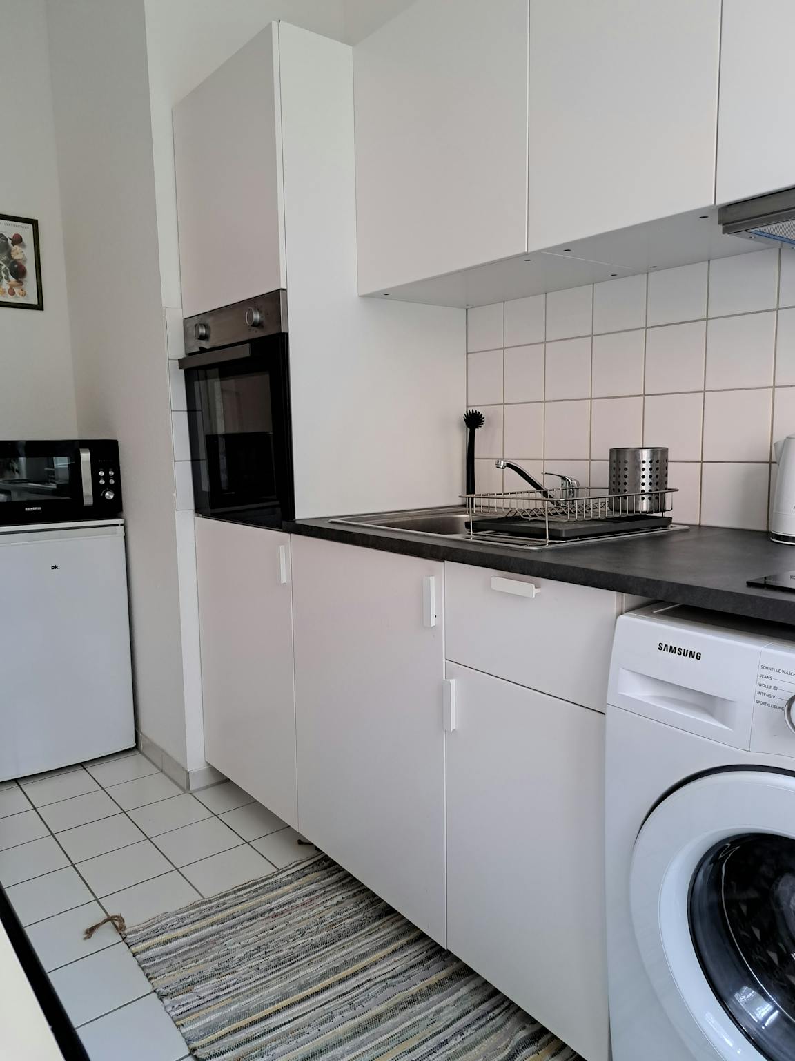 The apartment consists of one main room, a kitchen, and a bathroom with a window. The living/sleeping area is furnished with a double bed, a spacious wardrobe, dressers, a TV, and a desk ideal for working. The kitchen is fully equipped and also includes a washing machine. Additionally, you will find a kettle, toaster, coffee machine, and many other kitchen essentials. The dining table comfortably seats up to four people. The bathroom features a shower cabin.