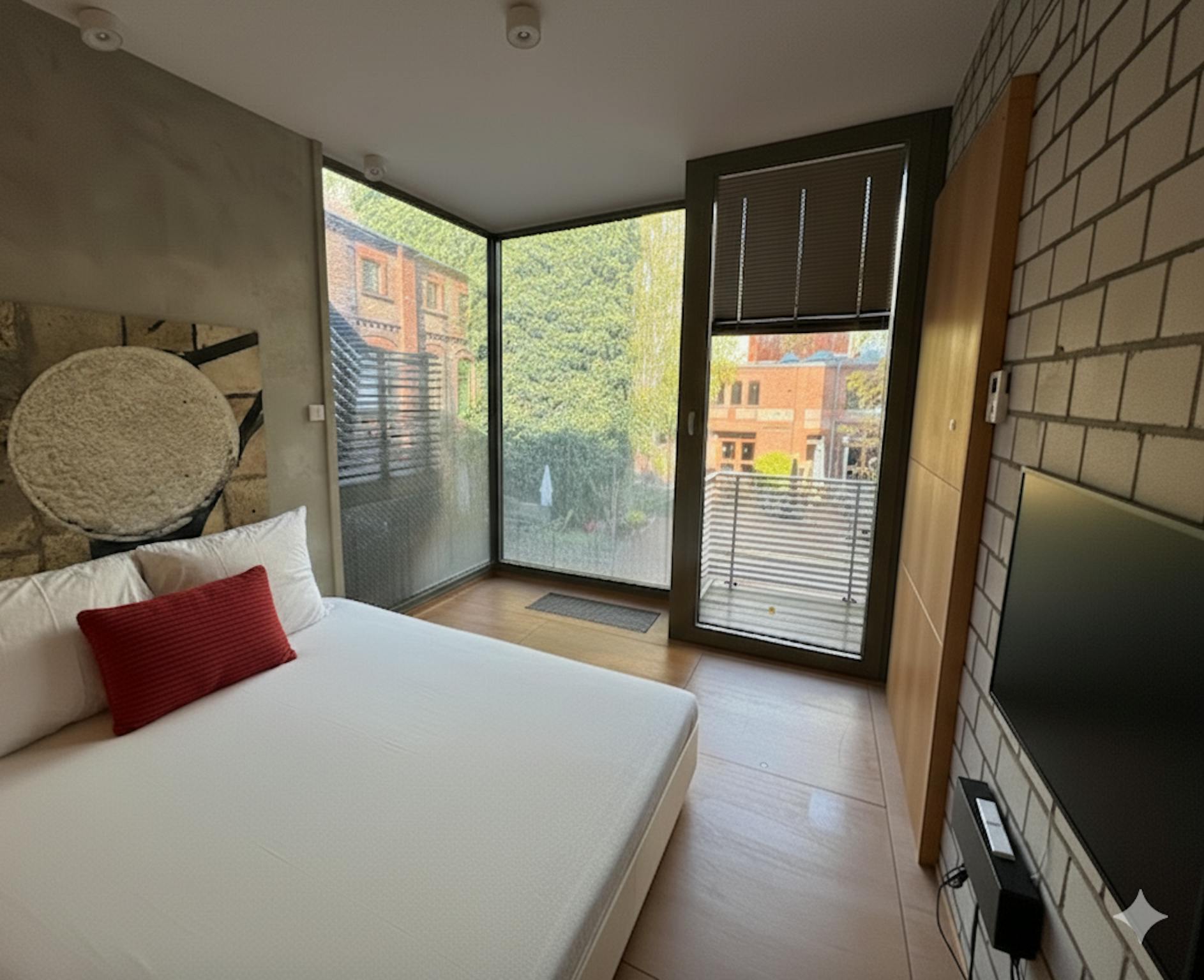Upstairs, the bedroom opens onto a small terrace, offering a private outdoor space. A fold-down desk is conveniently located next to the bed, perfect for work or study. The bathroom is equipped with a shower. The apartment also features clever storage solutions, with a built-in cabinet in the floor upstairs, making the most of every inch of space in this well-designed maisonette.