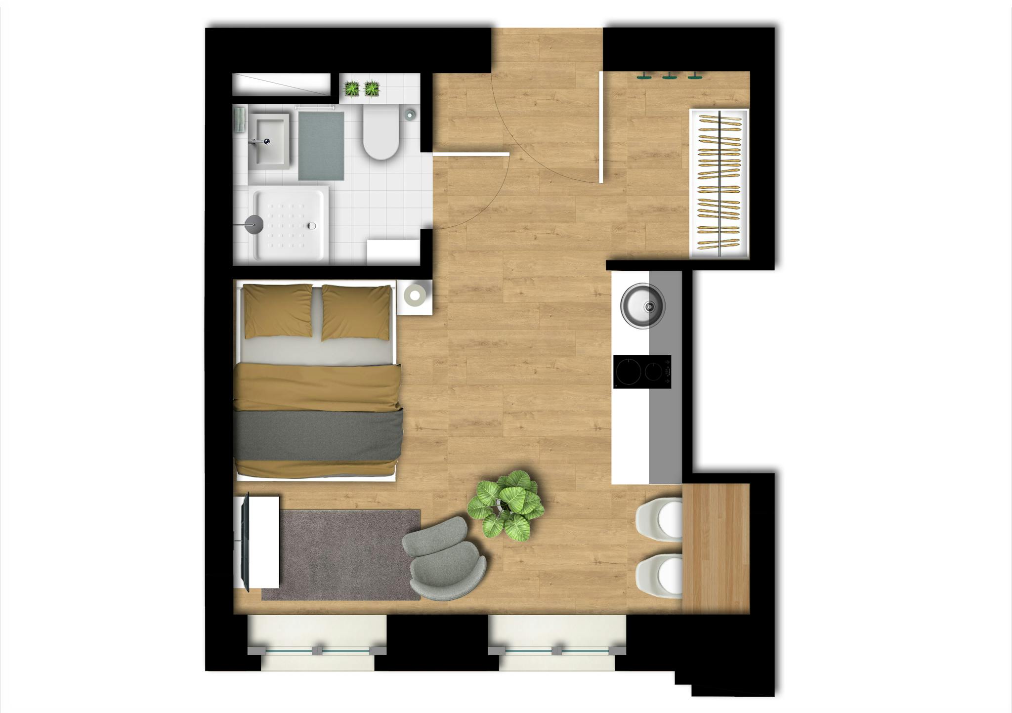 The kitchen is fully equipped with all essential utensils, including a microwave and refrigerator. A TV is also provided, ensuring a comfortable living experience from day one.
