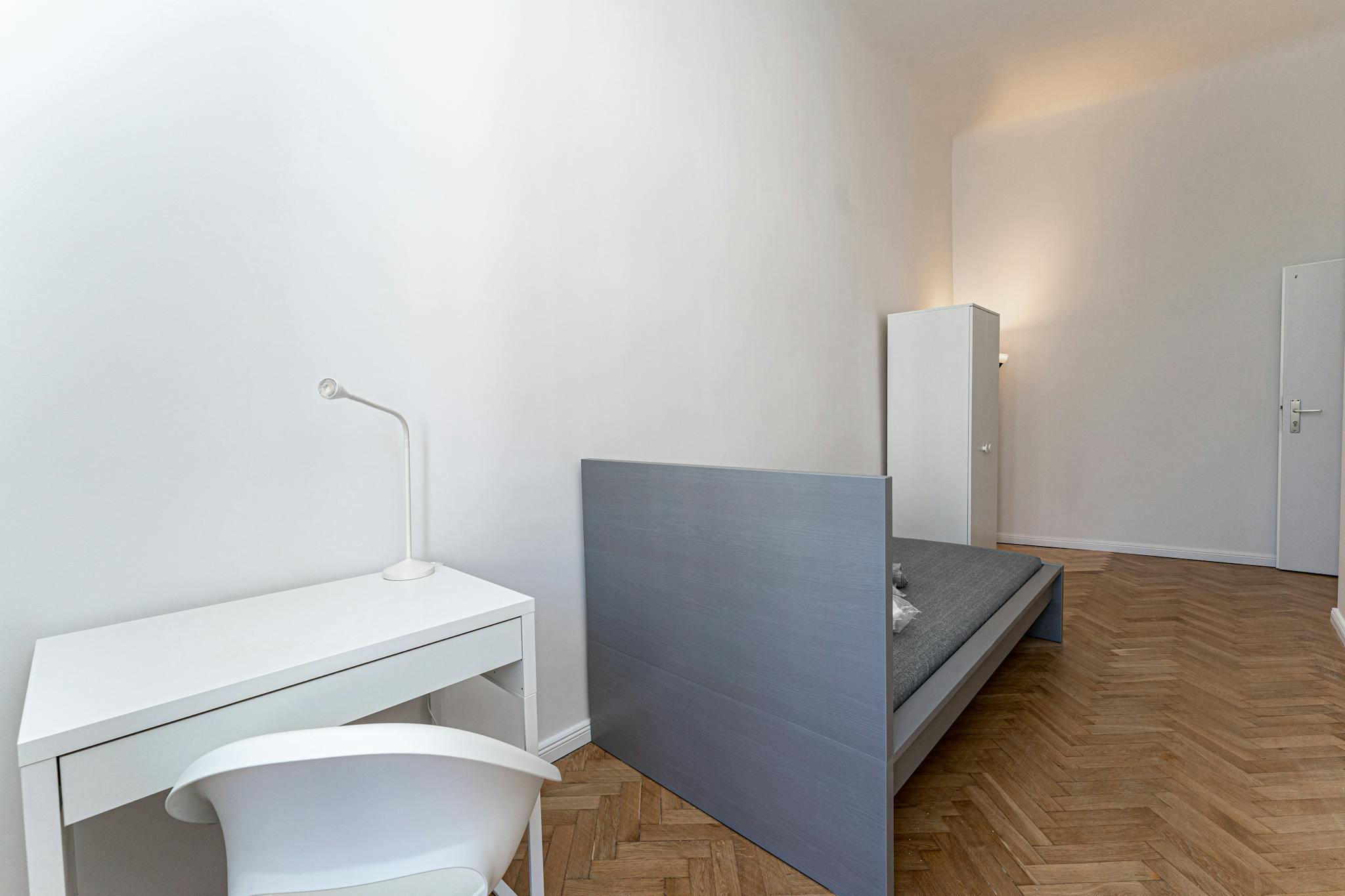 • Fully furnished with a desk, chair, and wardrobe