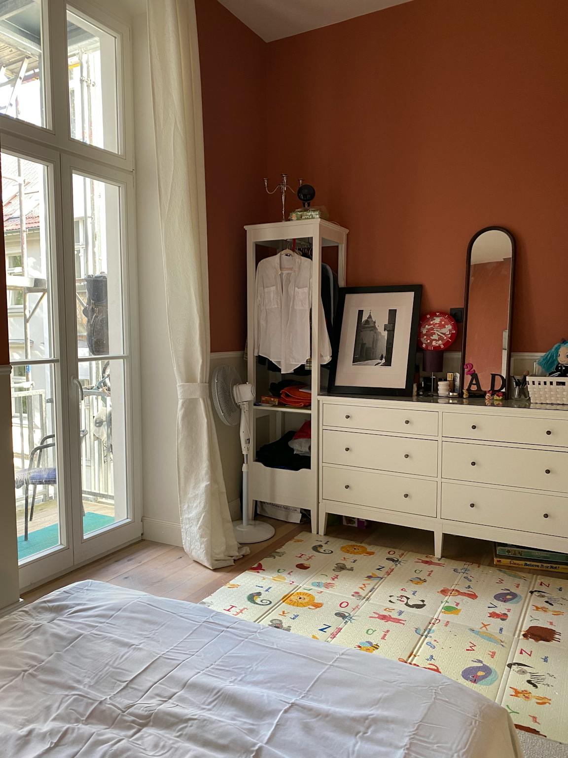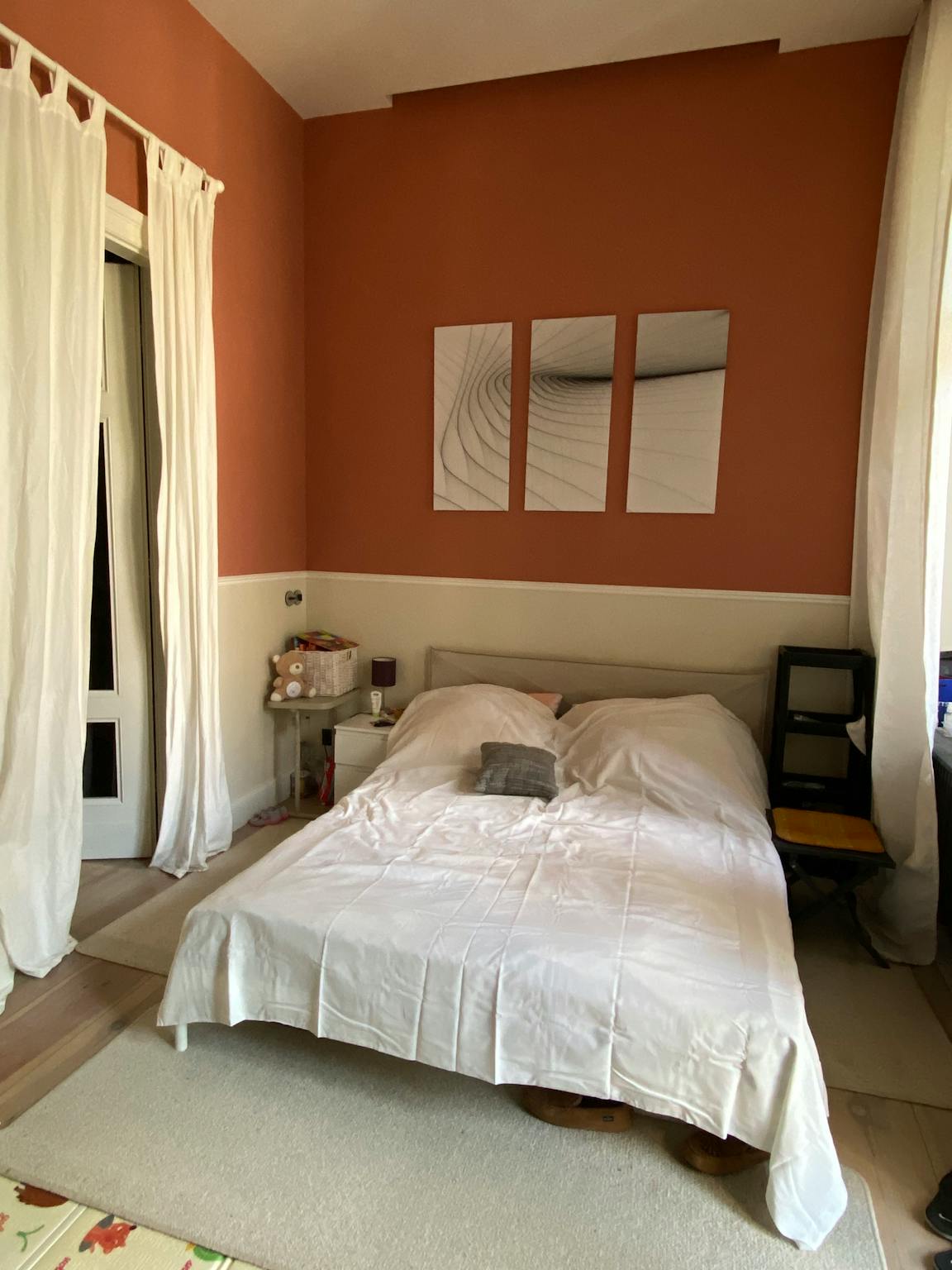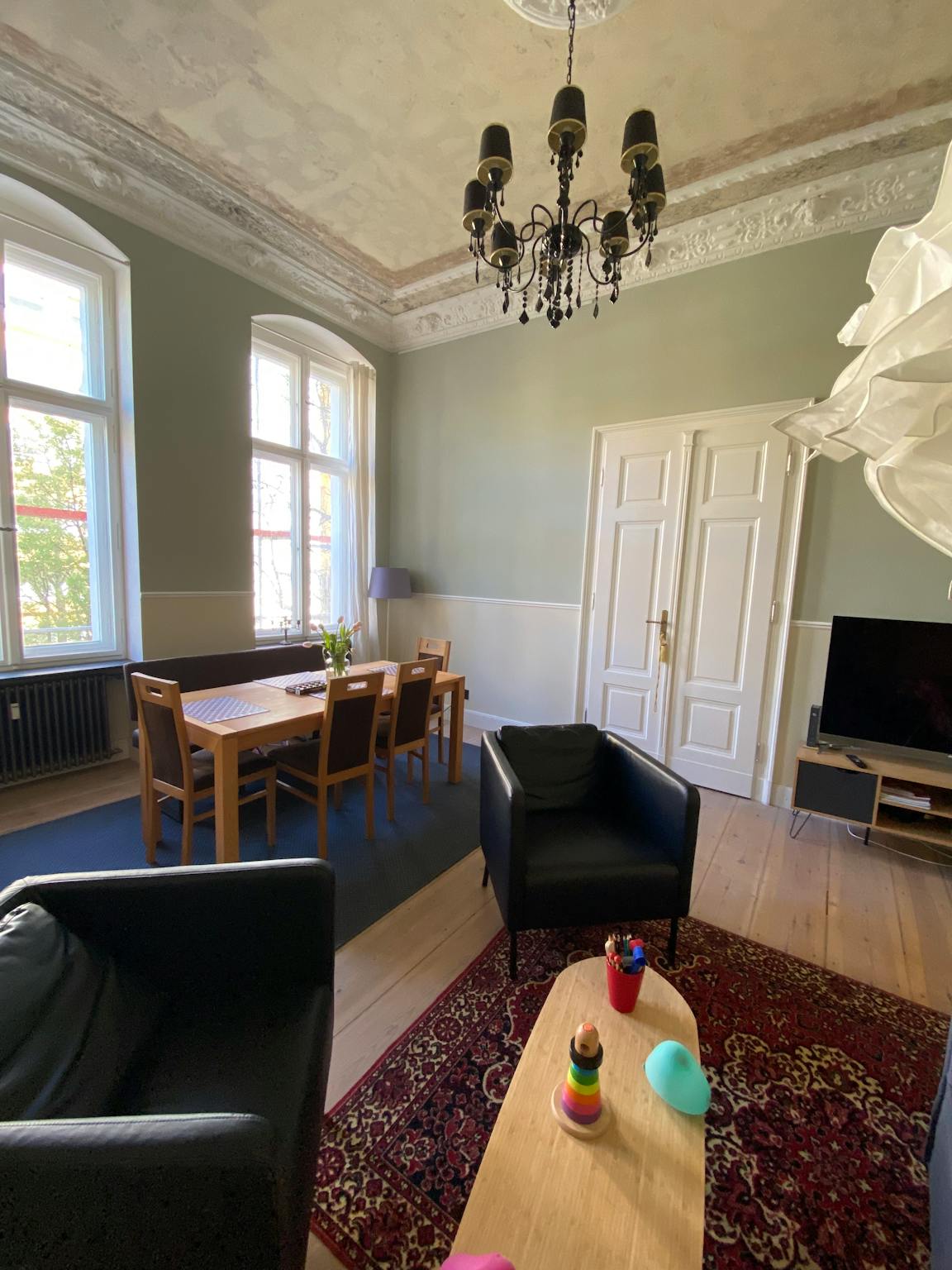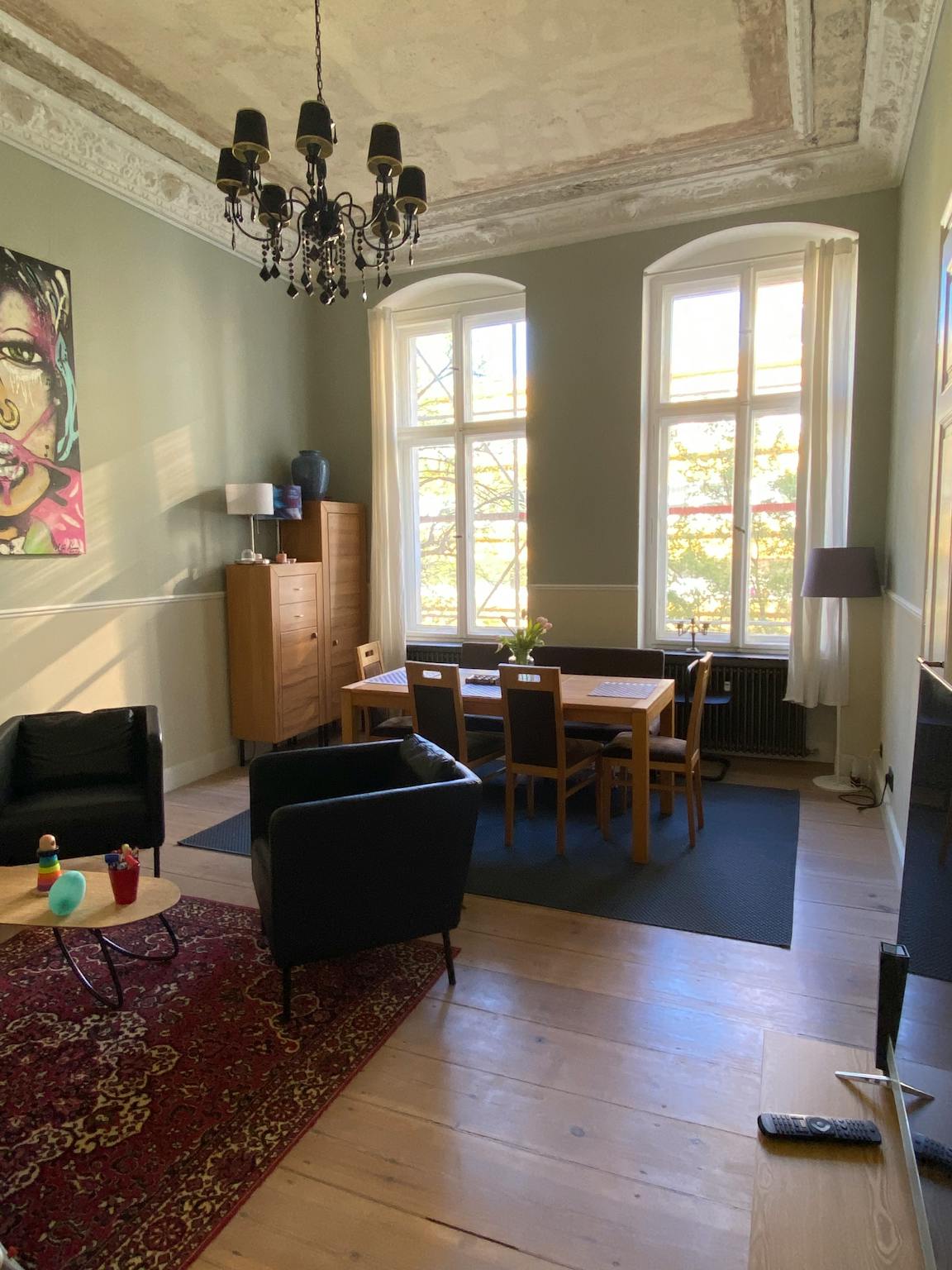 Non-SmokingNot allowedWe rent out a very nice apartment in a completely renovated classic building in Berlin Moabit (Tiergarten). The apartment is fully equipped and has 3 rooms. The apartment is in the front building on a quiet street with direct connections to the S-Bahn, bus and tram. The living room and guest bedroom ceilings feature lavishly restored original stucco molding and all rooms are painted in Farrow & Ball colours. The apartment is on the 2nd floor, the house has an elevator (half floor). There is central heating in the premises with the floors being covered with restored wooden floorboards.