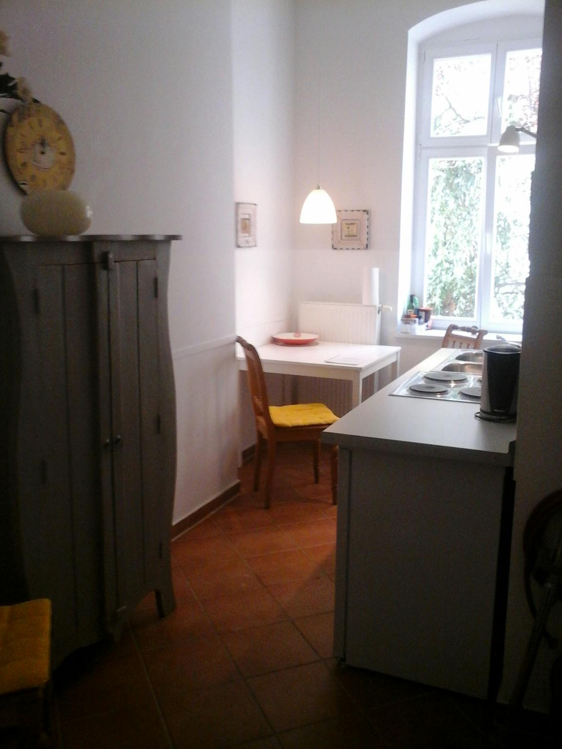 The apartment is very tastefully furnished and fully equipped in Mediterranean style. It is located in the quiet side wing, first floor of a newly renovated old building in Berlin. A living/sleeping area with adjoining balcony, a fully equipped kitchen and a bathroom with shower are spread over the 42 sqm of the apartment. From all rooms, you have a view into the green inner courtyard. The apartment is located in the very popular "in-district" Prenzlauer Berg. The special thing about Prenzlauer Berg is the boutiques with Berlin fashion labels and shops with funky trendy clothes, fashion and home accessories. Antiquarian bookshops, galleries and shops of local artists, craftsmen and designers are located in the direct vicinity of nice cafés and restaurants. Underground and S-Bahn station Schönhauser Allee and tram stops are close by to explore Berlin.