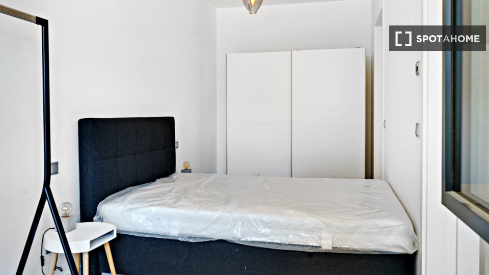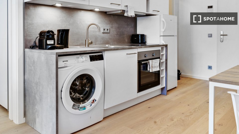 Shower, Mirror, Washing machine, Hanging Dryer, Double Bed, Wardrobe, Wooden Flooring, Cutlery, Pans & kitchen accessories, Fitted kitchen, Refrigerator, Toaster, Coffee Table, Iron, Dining Table, Vacuum Cleaner, Lamp, Chairs, Carpet