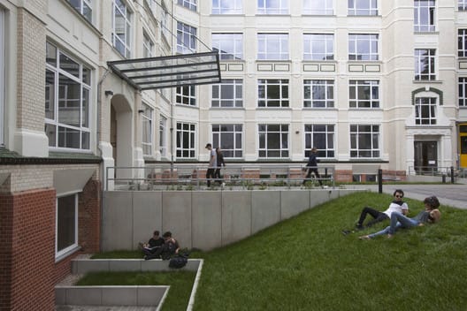 Rich community atmosphere with beautifully designed shared spaces: lounges, study rooms, café, fireplace corner, shared kitchens, laundry room, and a green courtyard.