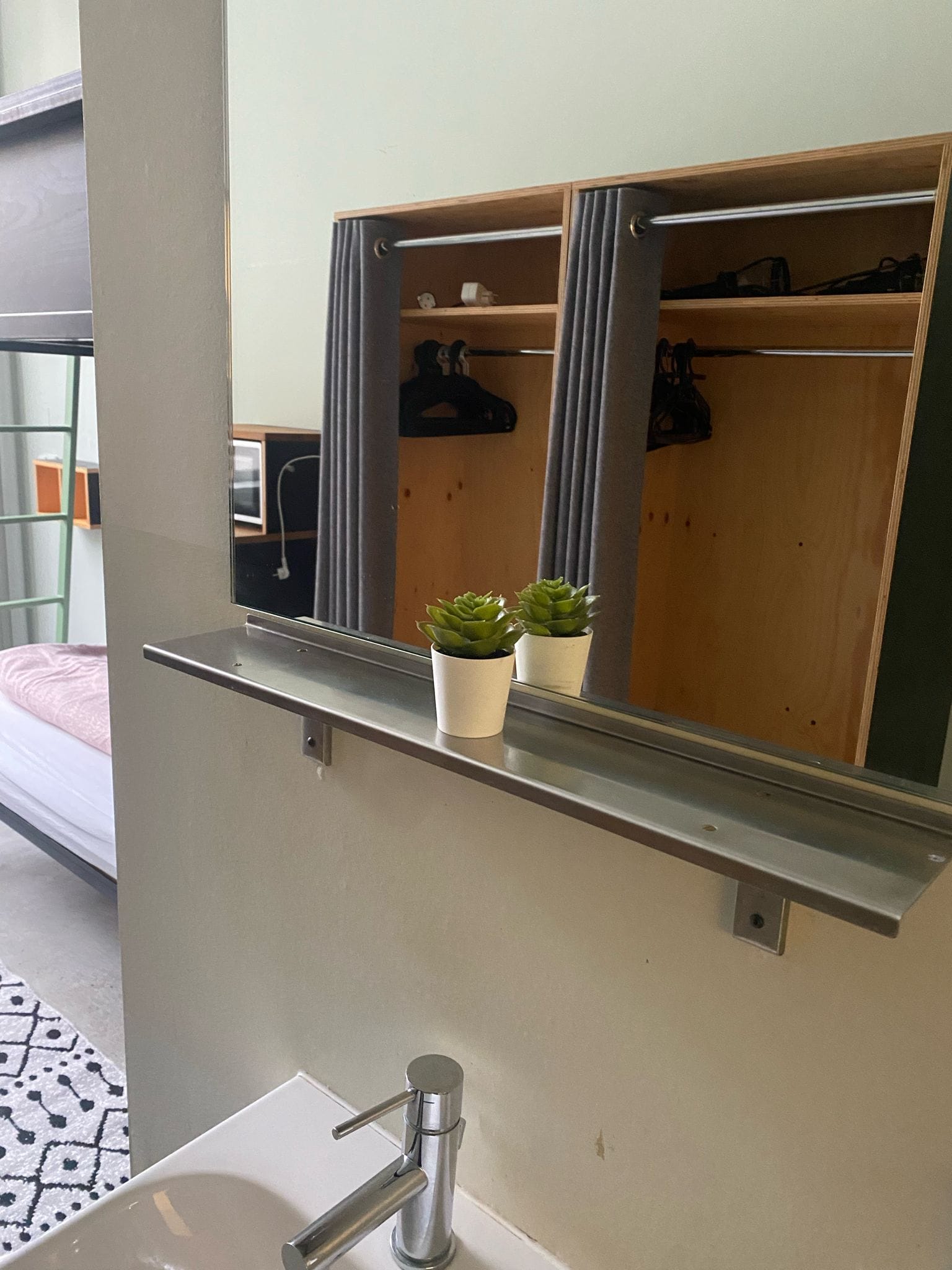 Shower, Towel rail heater, Mirror, Washing machine, Hanging Dryer, Single bed (90x200), Wardrobe, Cutlery, Pans & kitchen accessories, Fitted kitchen, Refrigerator, Dishwasher, Dining Table, Shelf, Working desk, Lamp, Chairs
