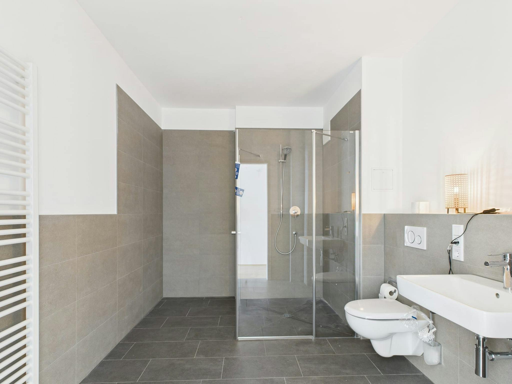The bathroom features a spacious, barrier-free shower, and the apartment includes a separate guest WC. An elevator provides easy access to this fully barrier-free, wheelchair-accessible apartment.