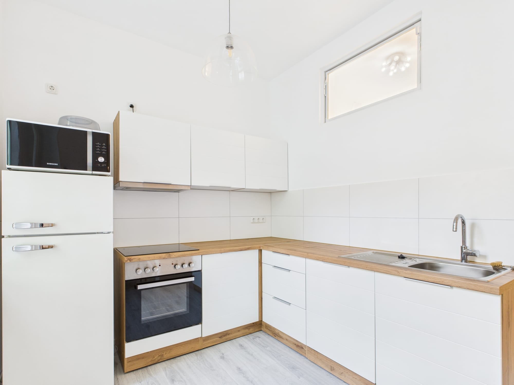 The apartment comes with complete, high-quality furnishings — from bed linen, wardrobe, curtain rods, and wooden flooring to a cozy living area with dining table, armchair, TV, and desk. Everything you need for a comfortable daily life is already in place, so you can move in and feel at home immediately.