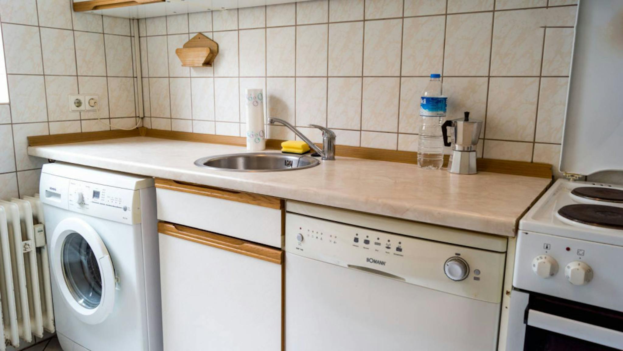 Die Wohnung hat insgesamt 75m2, verfügt über eine hell ausgestattete Küche mit modernen weißen Fliesen und marmorierten Arbeitsplatten. Das Badezimmer ist gut ausgestattet mit Badewanne, Spiegel, großem Fenster und großzügigem Waschbecken.