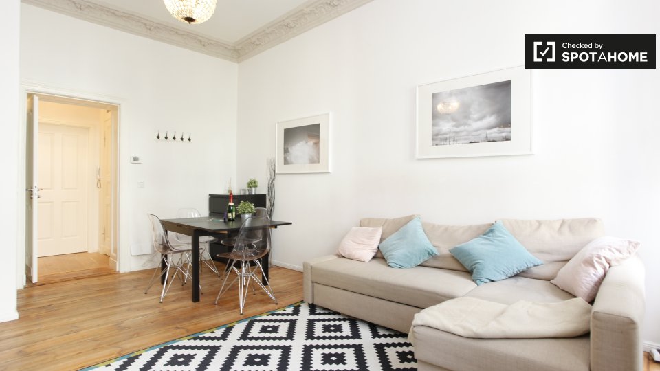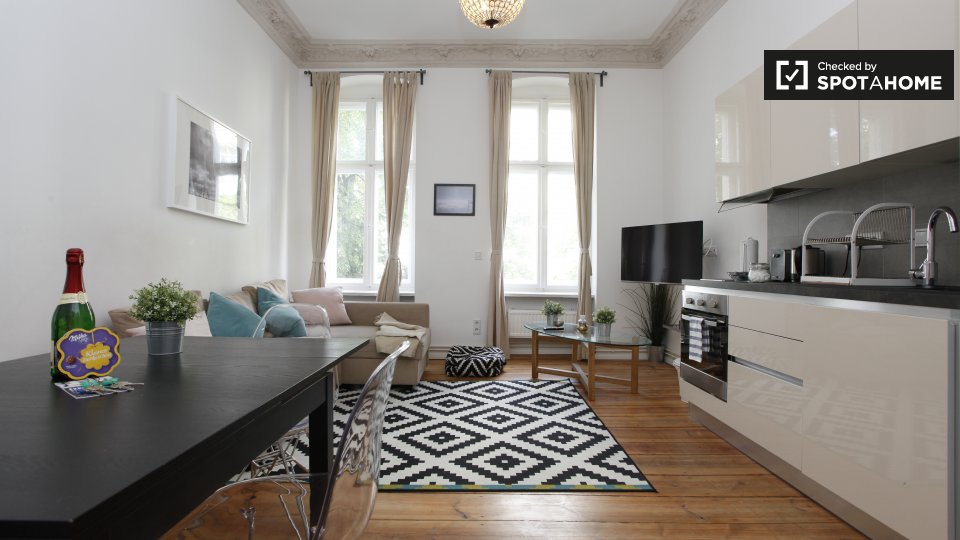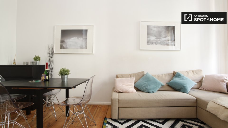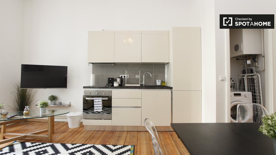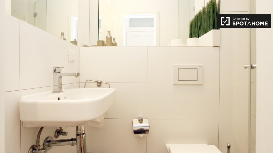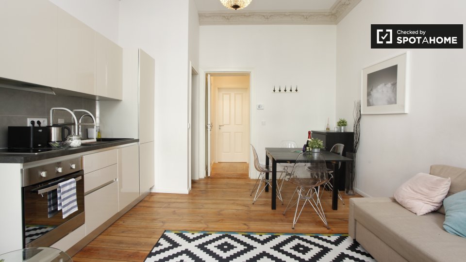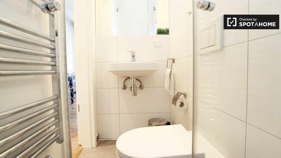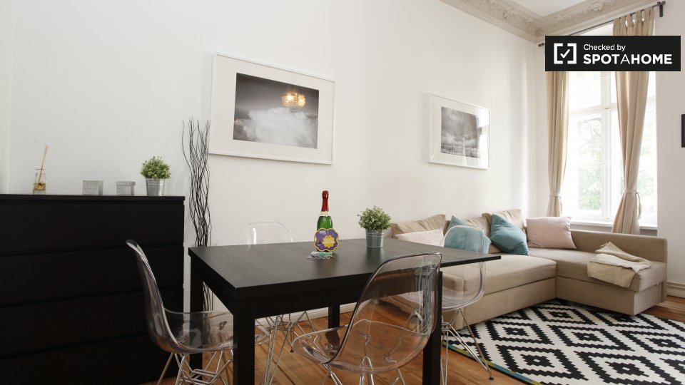 Pets allowedAllowedThis 1-bedroom apartment to rent on Biebricher Strasse is on the 2nd floor, so you don’t really have to worry about elevators. The property does have a washing machine, which saves time and is very convenient. The bathroom is a modern space with white tiles and a heated towel rack. The bedroom doesn’t have a huge amount of space, but it’s comfy, has room for storing your clothes and a window. The main space of the apartment is open-concept. It’s furnished with a sofa that has a chaise, coffee table, funky modern rug and TV. Across from the fully-equipped kitchen, which is along one wall, you can sit down to share a meal at a lovely 4-seat table.