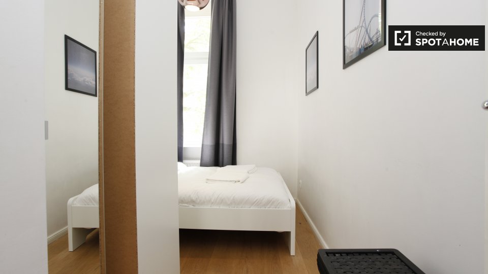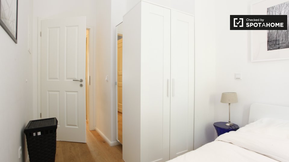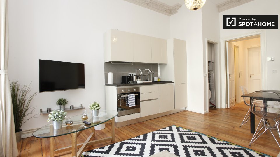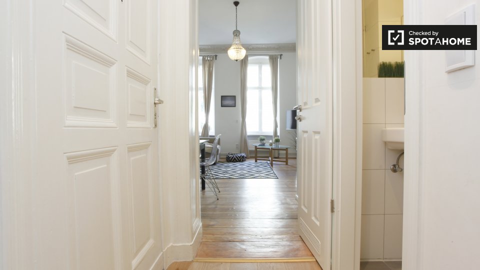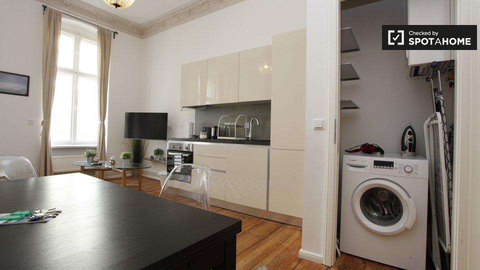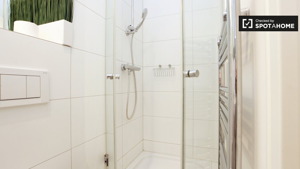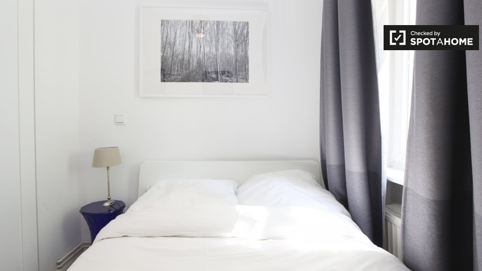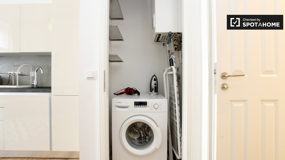Pets allowedAllowedThis 1-bedroom apartment to rent on Biebricher Strasse is on the 2nd floor, so you don’t really have to worry about elevators. The property does have a washing machine, which saves time and is very convenient. The bathroom is a modern space with white tiles and a heated towel rack. The bedroom doesn’t have a huge amount of space, but it’s comfy, has room for storing your clothes and a window. The main space of the apartment is open-concept. It’s furnished with a sofa that has a chaise, coffee table, funky modern rug and TV. Across from the fully-equipped kitchen, which is along one wall, you can sit down to share a meal at a lovely 4-seat table.