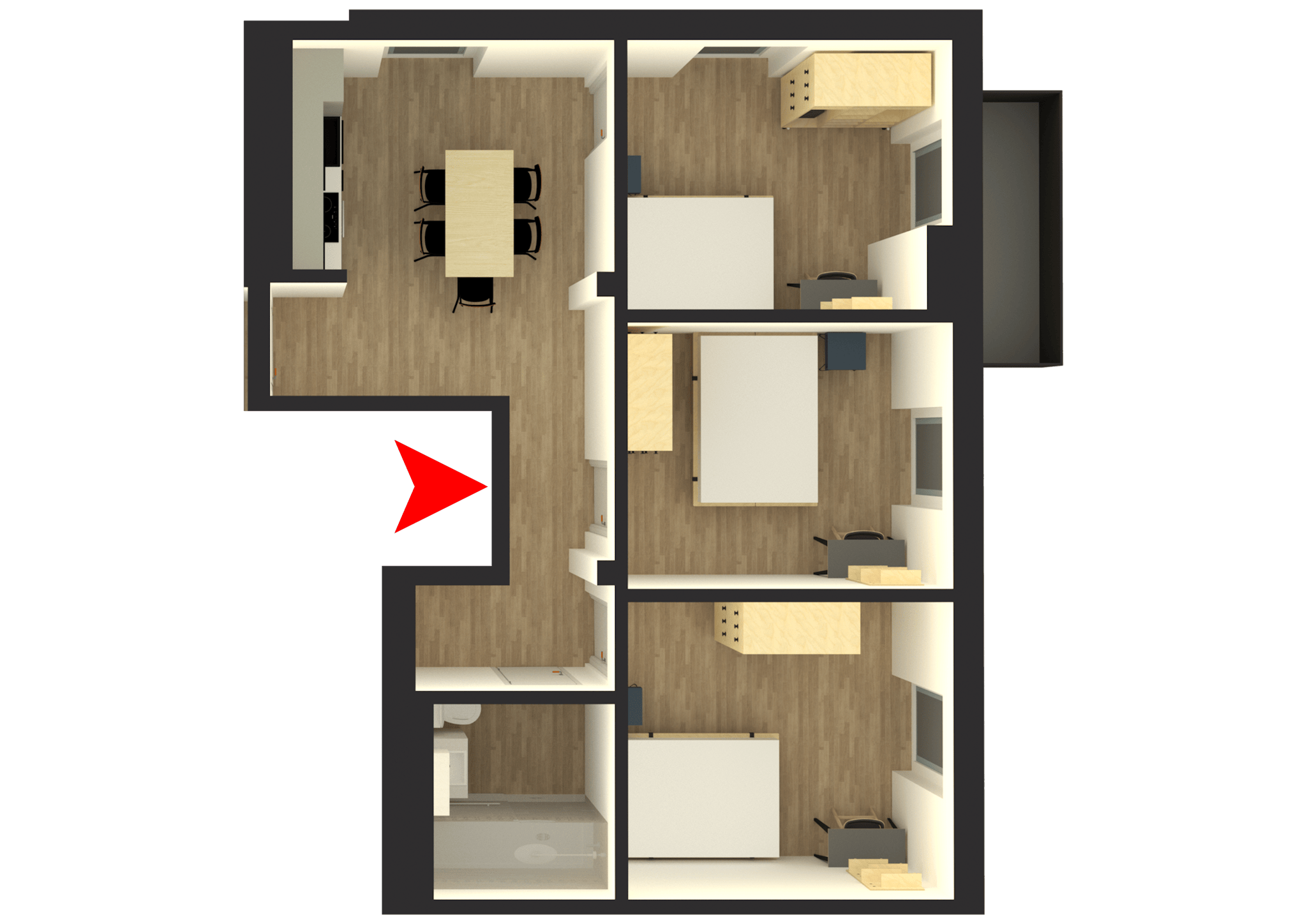 The kitchen is fully stocked for any wannabe-chef to get creative in – you’ll have all the pots, pans and knives, as well as a fridge to keep things cool. The dining area is a great space to hang and invite your roomies over for dinner. All apartments entail one or two spacious bathrooms that you’ll be sharing with your room mates.