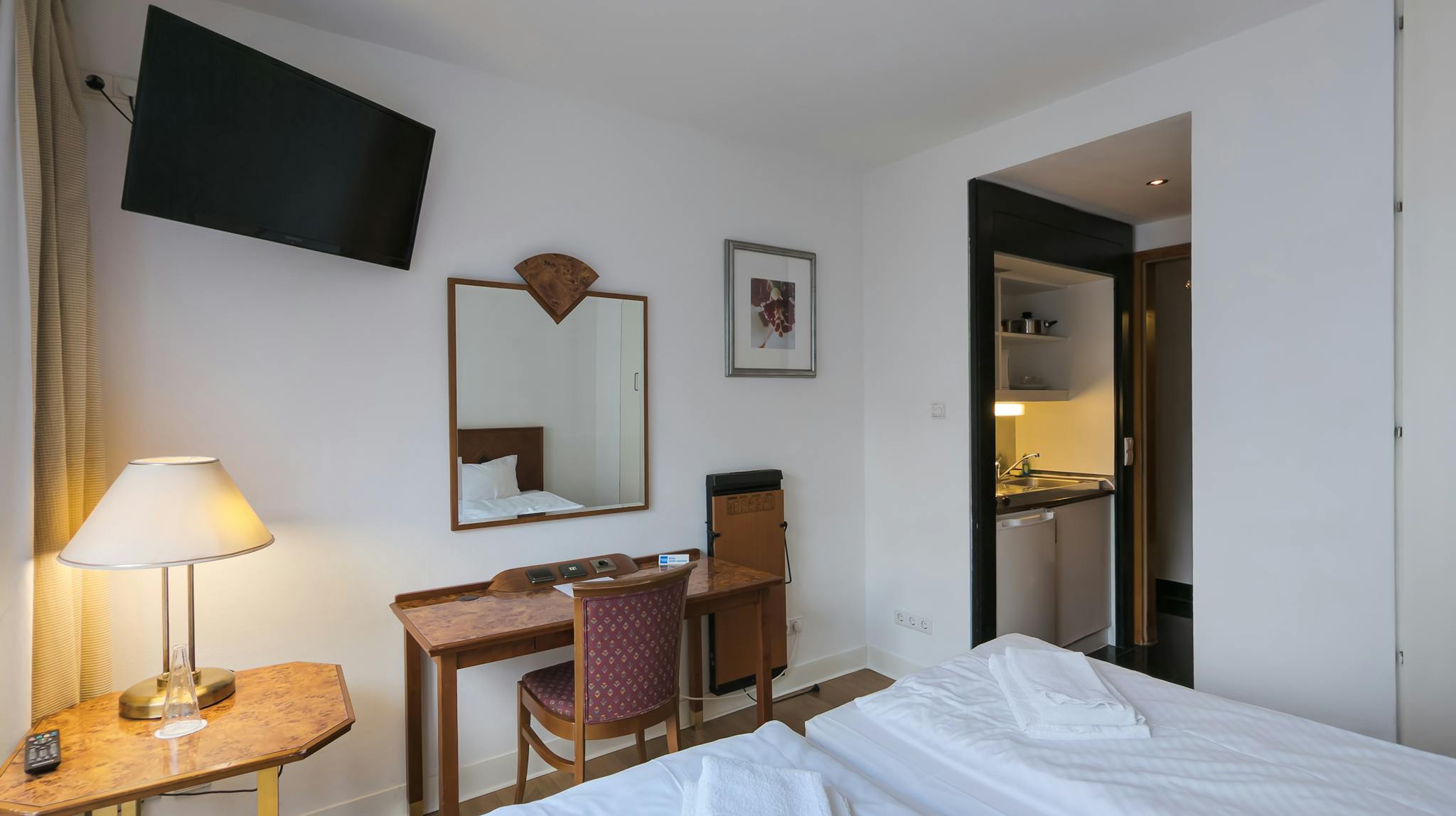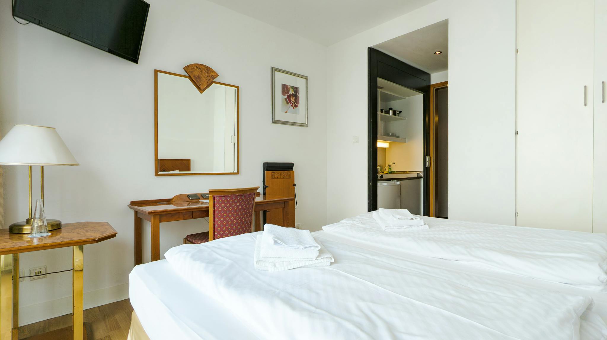 The bedroom exudes warmth and comfort, furnished with a plush double bed, stylish bedside tables, and soft lighting from elegant lamps that create a soothing ambiance. A spacious desk and chair provide an ideal workspace for productivity, while a TV adds a delightful touch of entertainment. The high-quality wooden furniture enhances the cozy, homely atmosphere, making it an ideal sanctuary for unwinding and recharging. Additionally, the apartment boasts a charming French balcony, offering a lovely outdoor space to enjoy fresh air and the surrounding views.