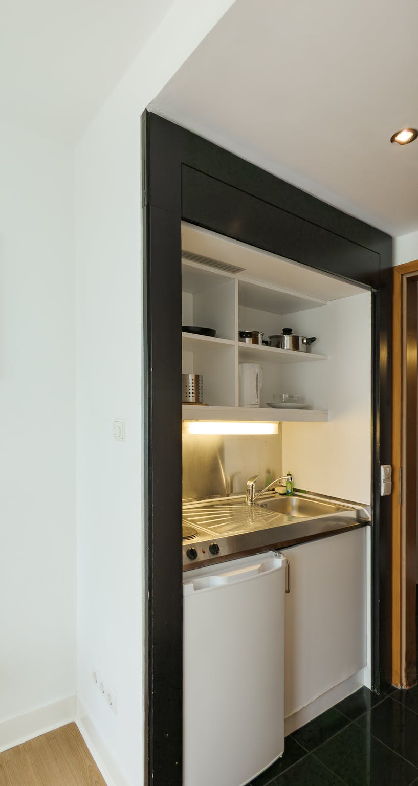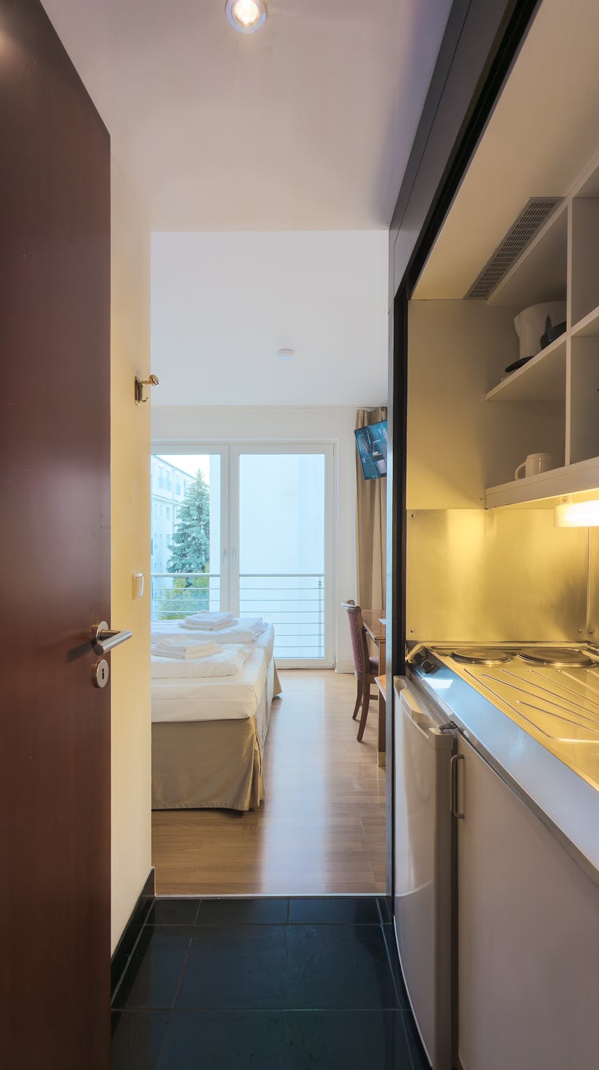 The Apartment is a serene retreat, offering 21 m2 of thoughtfully designed living space perfect for solo travelers. It features a welcoming entrance, a modern bathroom, and a kitchenette equipped with a fridge and essential utensils to ensure a comfortable stay.