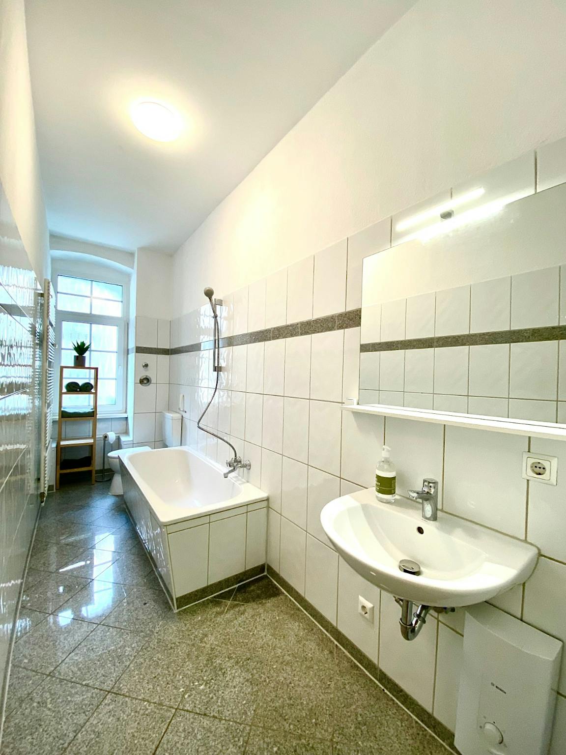 Das hell geflieste Badezimmer verfügt über eine Badewanne und ein WC.
