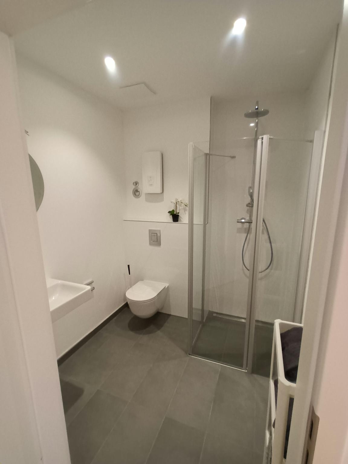 Weiterhin verfügt das Apartment über ein sehr geräumiges Badezimmer mit barrierefreier Dusche und Regal (inkl. Handtücher).