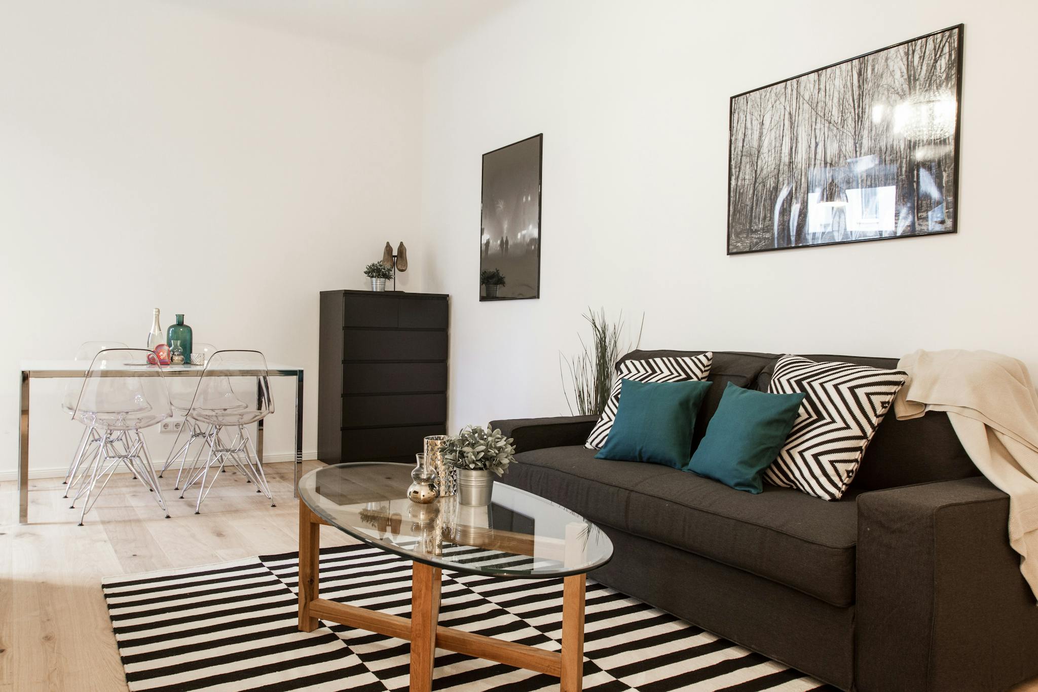 The apartment will accommodate 3 in total, with a double bedroom and a sofa bed for 2 in the (hidden) room. It is fully furnished with a new TV, fully equipped kitchen for entertaining and an inviting dining area. We will provide everything you need like linens, towels and shower amenities.