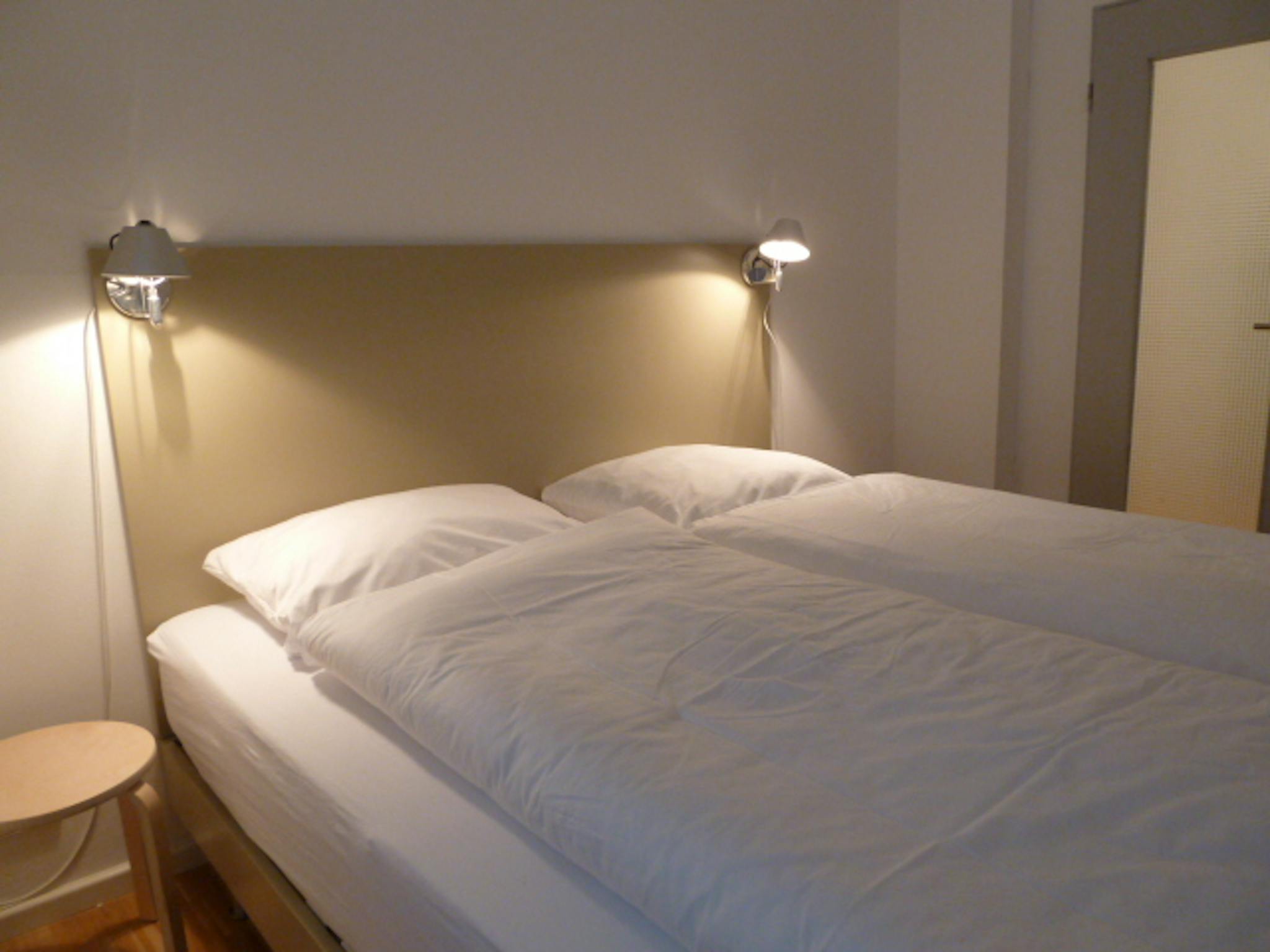 The bedroom contains a king-size bed with two separate mattresses (200 x 90 cm). It faces the quiet, green back yard.