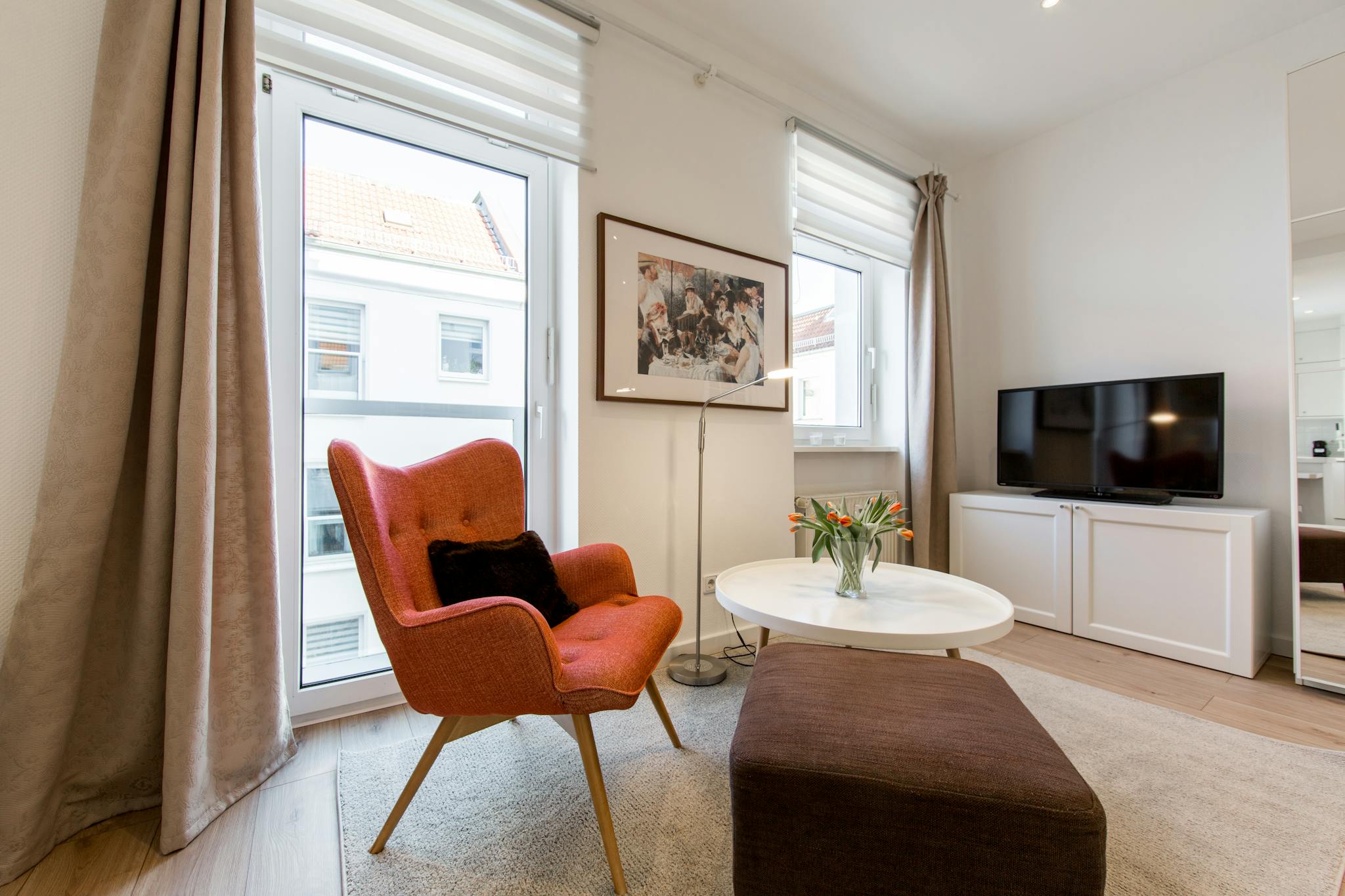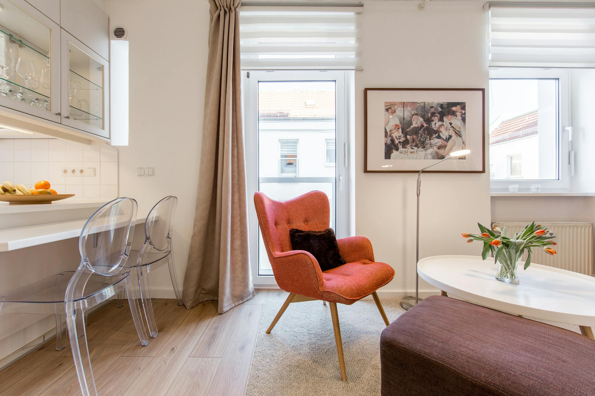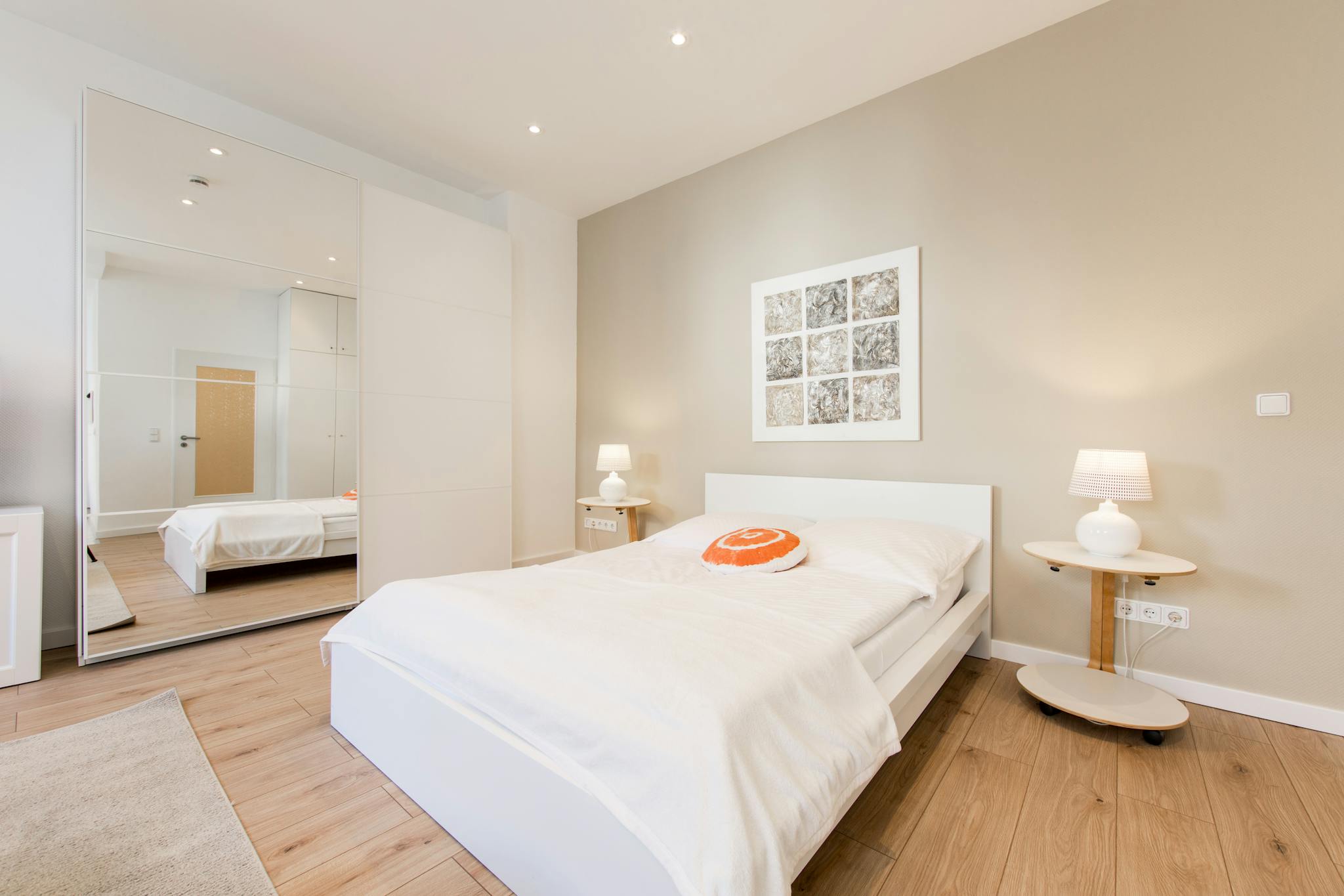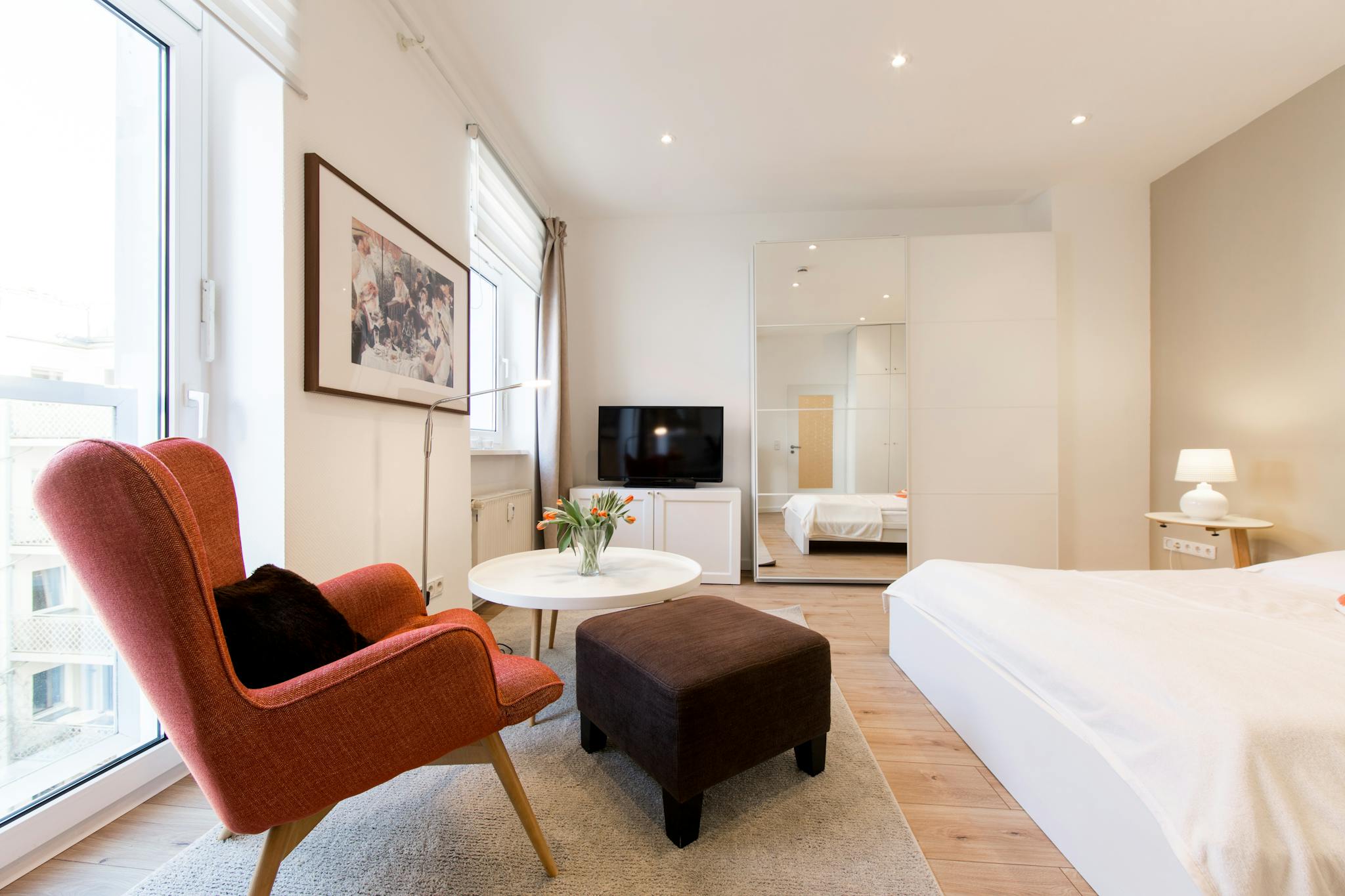 Non-SmokingNot allowedWunderschönes, helles, komplett ausgestattetes Apartment (3. OG) im begehrten Prenzlauer Berg. Alles ist vorhanden: Doppelbett(140x200), Schrankwand, Lounge-Sessel, Essthresen/nutzbar als Schreibtisch, offene Küche mit Waschtrockner, Herd, Backofen, Spülmaschine, Kühl/Gefrierschrank, etc. Bad mit Wanne/auch als Dusche zu nutzen, Flur mit Schuhschrank und Garderobe. In der Miete ist auch eine Reinigung ein Mal im Monat, GEZ Gebühren, WLAN, die üblichen Nebenkosten und ein Concierge Service enthalten. Nur der Strom wird separat nach persönlichem Verbrauch alle 3 Monate in Rechnung gestellt. Die Wohnung ist ideal für 1 Person.