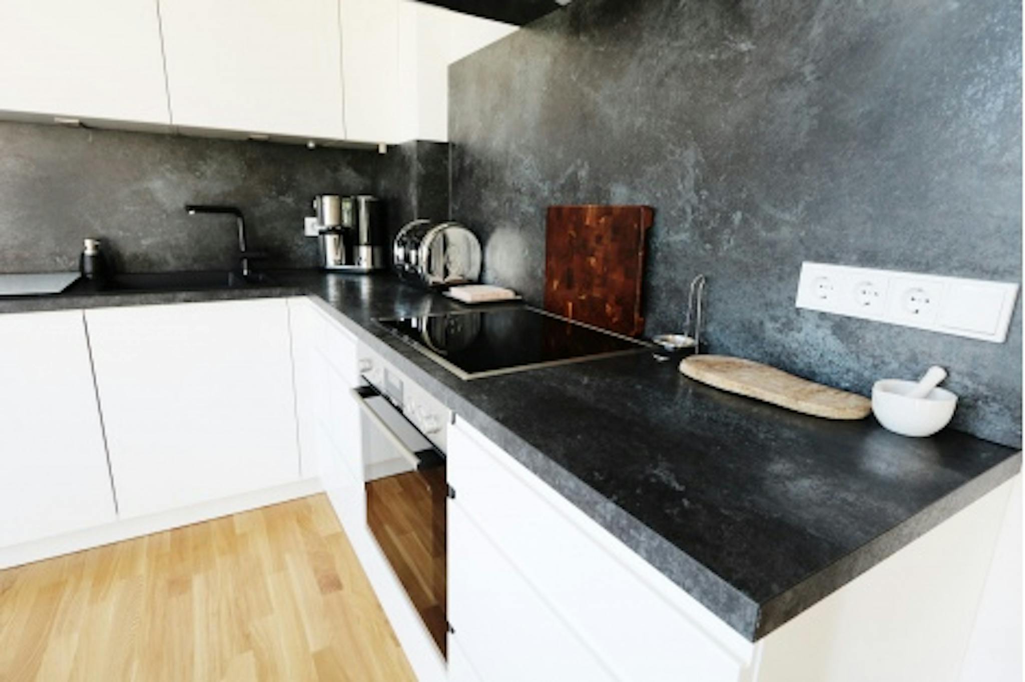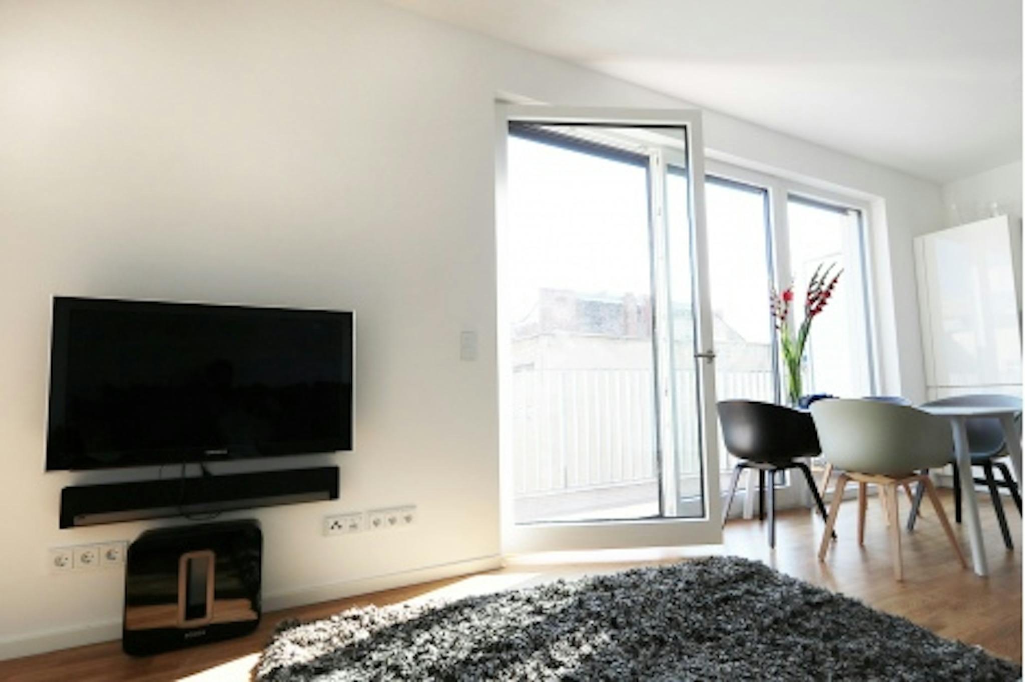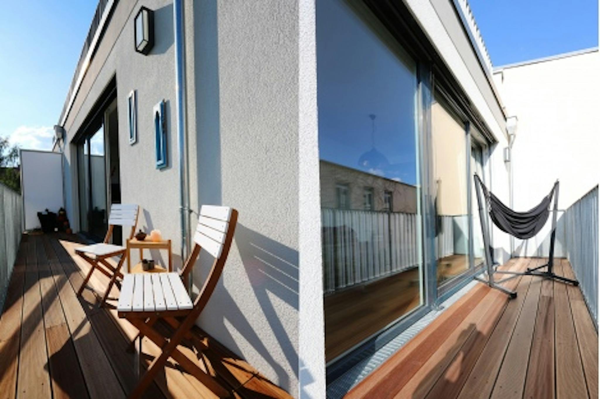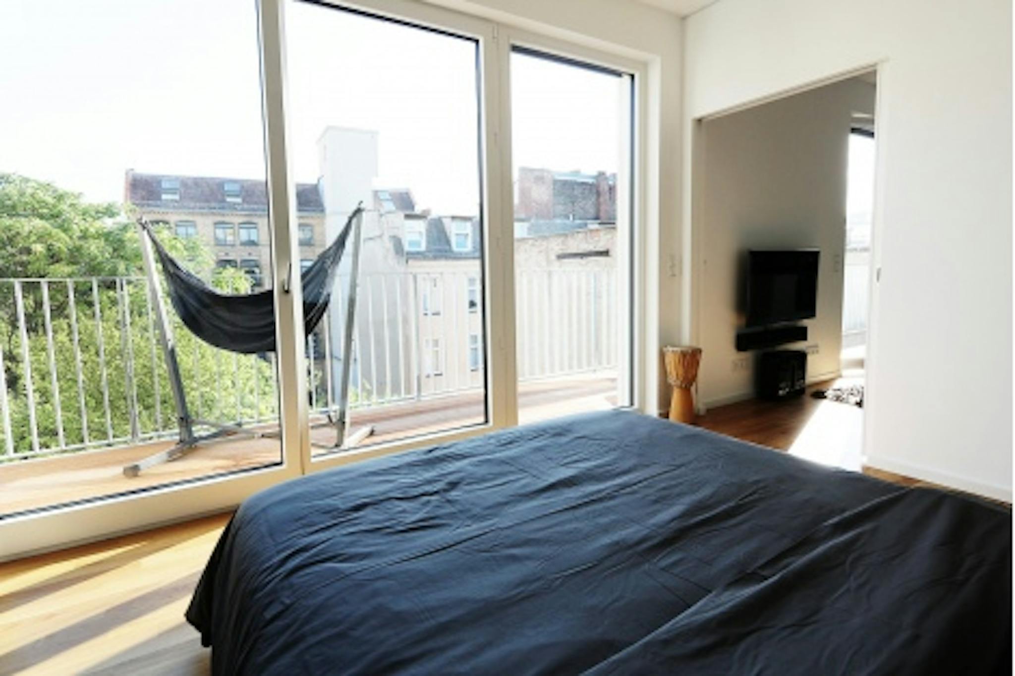 Non-SmokingNot allowedBrand new Apartment on the 4th floor (lift), wooden floor parquet, bay to ceiling windows which allow lots of sunlight, bedroom with en-suite bathroom and walk in rain shower. From there step out onto the large terrace which goes along the entire Apartment. The modern open plan kitchen is fully equipped including a Nespresso machine and a large breakfast/dinner table next to one of the door windows - which is facing the terrace. A separate toilet for guests is near the entrance. Washing machine and a dryer is placed in the master bathroom. The highlight is the terrace - a real gem with sunshine all day long.