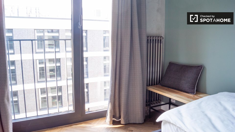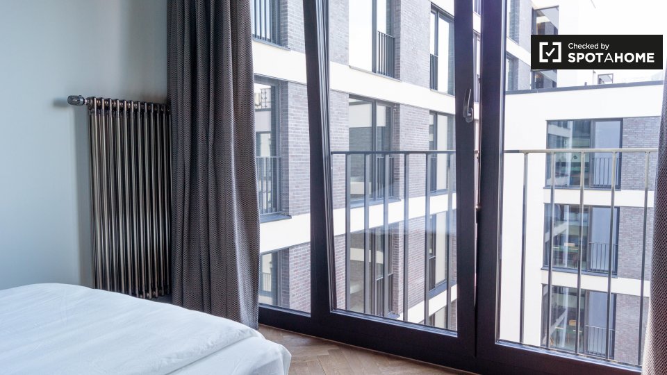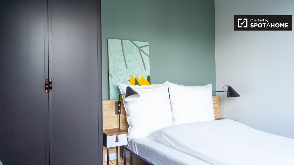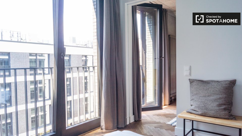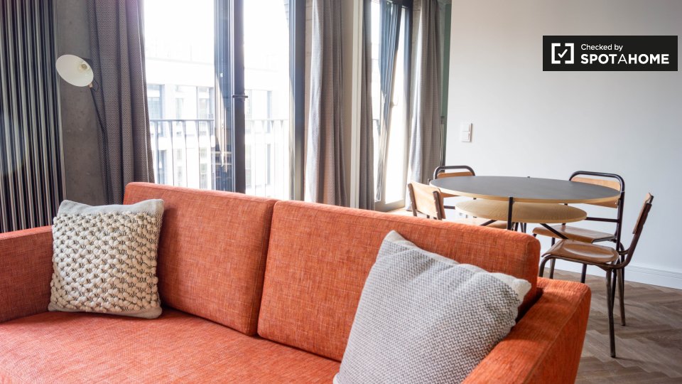 Pets not allowedNot allowedThis chic apartment with 2 bedrooms to rent on Brunnenstraße is located in Mitte, Berlin. It’s an open space apartment with a cozy bedroom and modern bathroom. Both bedrooms have wardrobes and French balconies. The combined kitchen, living and dining area has a retro mid-century mod decor. The kitchen is fully equipped, and the rest of the area is furnished with a dining table, sofa, armchairs and TV. The bathroom is modern with a tub, and the building has a common laundry facility.