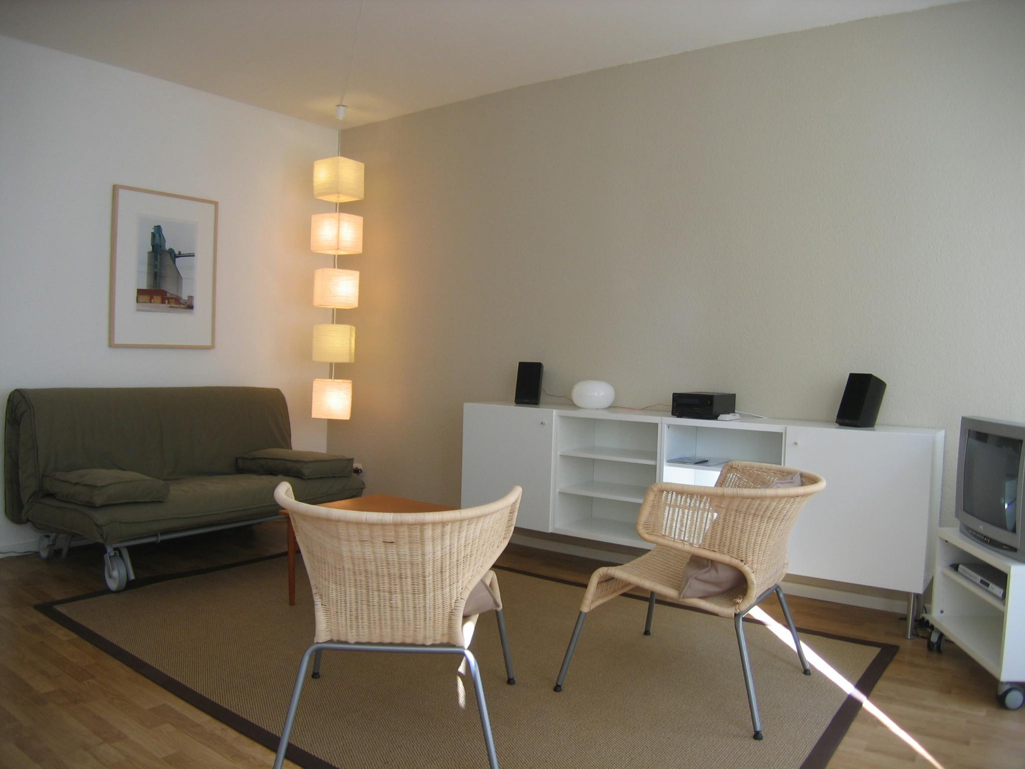 The spacious living/eating space (approx. 30 sqm) features a comfortable sofa-bed (205 x 160 cm) and faces the quiet residential street.