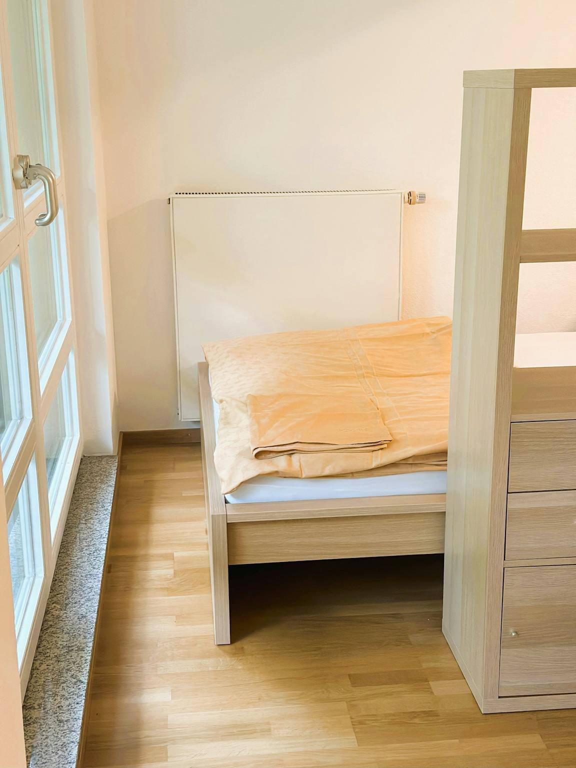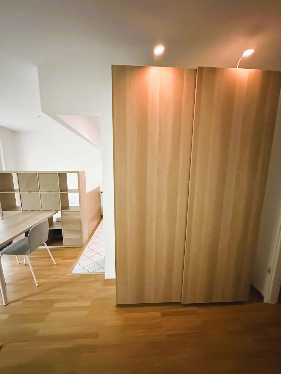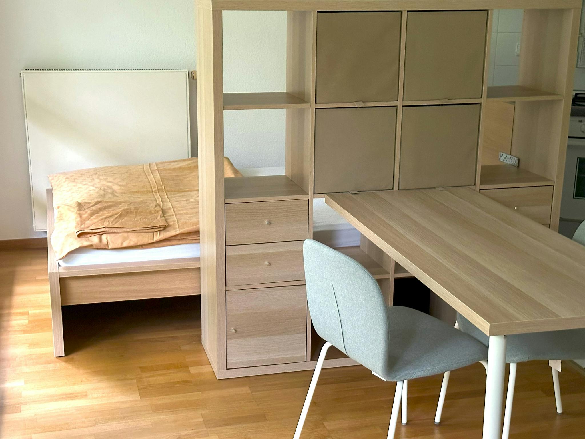 A generous shelf separates the work and dining area from the sleeping area with a double bed. In the entrance area of the living and sleeping area there is a large sliding wardrobe with plenty of storage space for clothing.