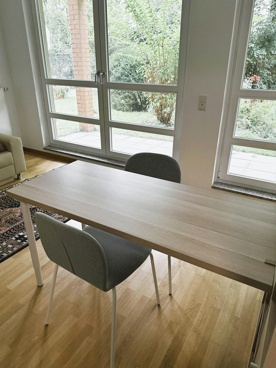 Next to the living area there is a dining and work area with a table that can be used as both a dining table and a desk.