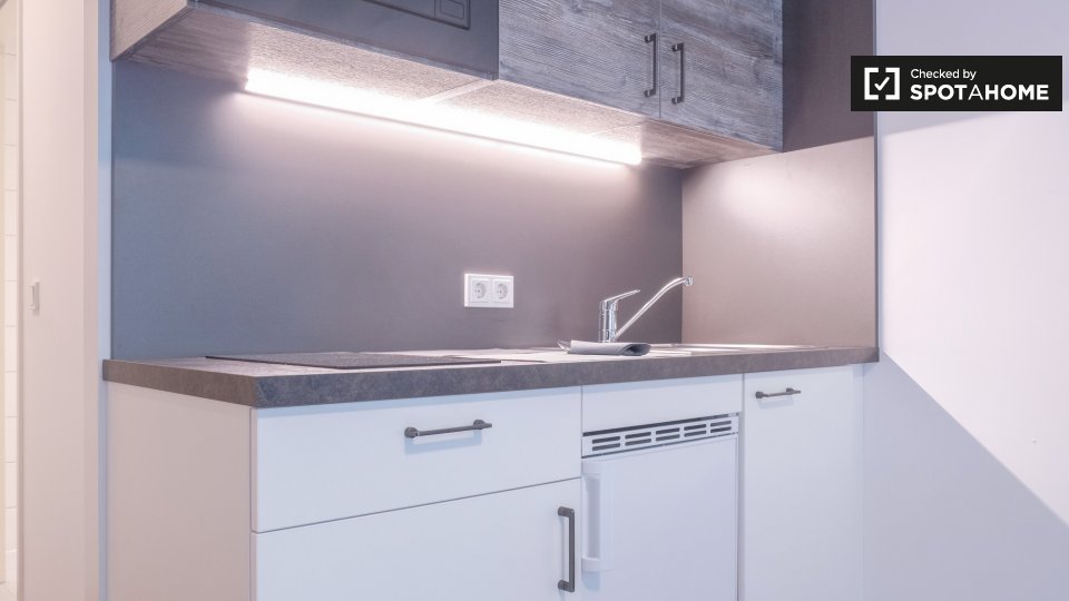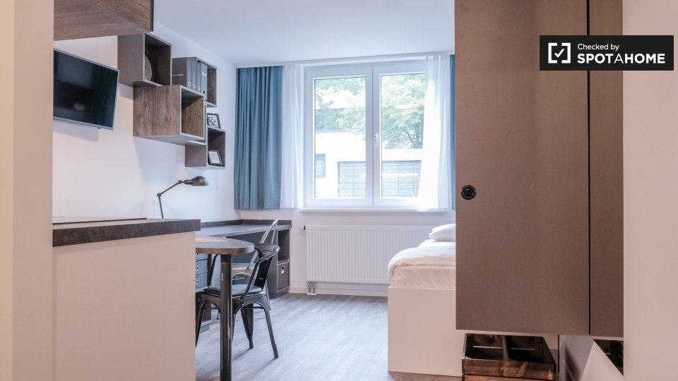 This is a slick studio apartment on Alfred-Jung-Straße, Berlin. It boasts a combined living and sleeping area, modern decor, and it's got some really cool spaces nearby.